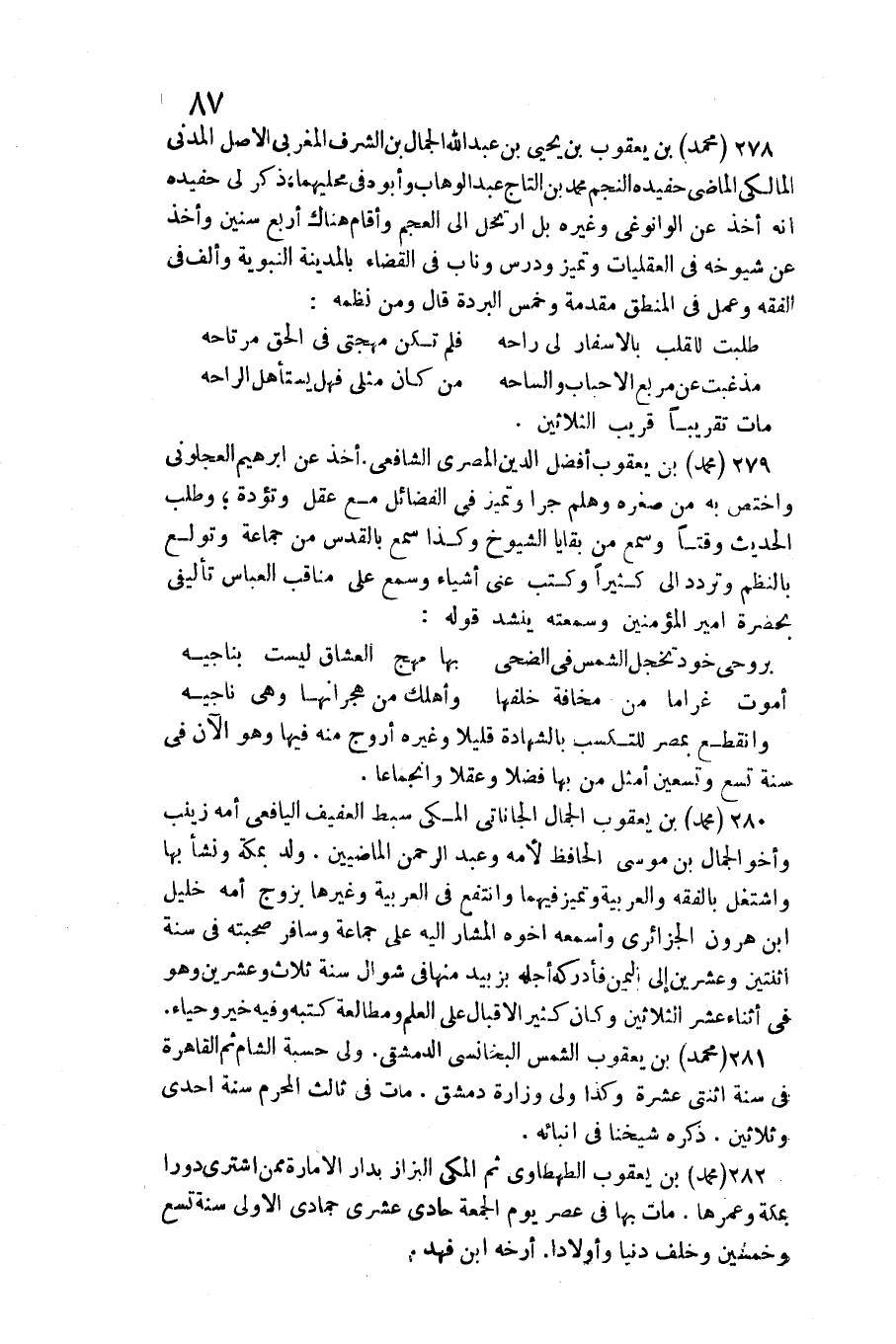 278 - مُحَمَّد بن يَعْقُوب بن يحيى بن عبد الله الْجمال بن الشّرف المغربي الأَصْل الْمدنِي الْمَالِكِي الْمَاضِي حفيده النَّجْم مُحَمَّد بن التَّاج عبد الْوَهَّاب / وَأَبوهُ فِي محليهما، ذكر لي حفيده أَنه أَخذ عَن الوانوغي وَغَيره بل ارتحل إِلَى الْعَجم وَأقَام هُنَاكَ أَربع سِنِين وَأخذ عَن شُيُوخه فِي العقليات وتميز ودرس وناب فِي الْقَضَاء بِالْمَدِينَةِ النَّبَوِيَّة وَألف فِي الْفِقْه وَعمل فِي الْمنطق مُقَدّمَة وَخمْس الْبردَة قَالَ وَمن نظمه: