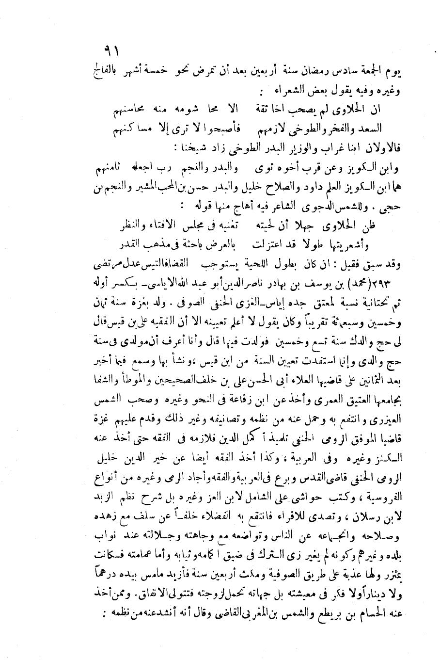293 - مُحَمَّد بن يُوسُف بن بهادر نَاصِر الدّين أَبُو عبد الله الأياسي بِكَسْر أَوله ثمَّ تَحْتَانِيَّة نِسْبَة لمعتق جده إِيَاس الْغَزِّي الْحَنَفِيّ الصُّوفِي. / ولد بغزة سنة ثَمَان وَخمسين وَسَبْعمائة تَقْرِيبًا وَكَانَ يَقُول لَا أعلم تَعْيِينه إِلَّا أَن الْفَقِيه عَليّ بن قيس قَالَ لي حج والدك سنة تسع وَخمسين فَولدت فِيهَا قَالَ وَأَنا أعرف أَن مولدِي فِي سنة حج وَالِدي وَإِنَّمَا اسْتَفَدْت تعْيين السّنة من ابْن قيس، وَنَشَأ بهَا وَسمع فِيمَا أخبر بعد الثَّمَانِينَ على قاضيها الْعَلَاء أبي الْحسن عَليّ بن خلف الصَّحِيحَيْنِ والموطأ والشفا بجامعها الْعَتِيق الْعمريّ وَأخذ عَن ابْن زقاعة فِي النَّحْو وَغَيره وَصَحب الشَّمْس العيزري وانتفع بِهِ وَحمل عَنهُ من نظمه وتصانيفه وَغير ذَلِك وَقدم عَلَيْهِم غَزَّة قَاضِيا الْمُوفق الرُّومِي الْحَنَفِيّ تلميذ أكمل الدّين فلازمه فِي الْفِقْه حَتَّى أَخذ عَنهُ الْكَنْز وَغَيره وَفِي الْعَرَبيَّة، وَكَذَا أَخذ الْفِقْه أَيْضا عَن خير الدّين خَلِيل الرُّومِي الْحَنَفِيّ قَاضِي الْقُدس وبرع فِي الْعَرَبيَّة وَالْفِقْه وأجاد الرَّمْي وَغَيره من أَنْوَاع الفروسية، وَكتب حَوَاشِي على الشَّامِل لِابْنِ الْعِزّ وَغَيره بل شرى نظم الزّبد لِابْنِ رسْلَان، وتصدى للإقراء فَانْتَفع بِهِ الْفُضَلَاء خلفا عَن سلف مَعَ زهده وصلاحه وانجماعه عَن النَّاس وتواضعه مَعَ وجاهته وجلالته عِنْد نواب بَلَده وَغَيرهم وَكَونه لم يُغير زِيّ التّرْك فِي ضيق أكمامه وثيابه وَأما عمَامَته فَكَانَت بمئزر وَلها)