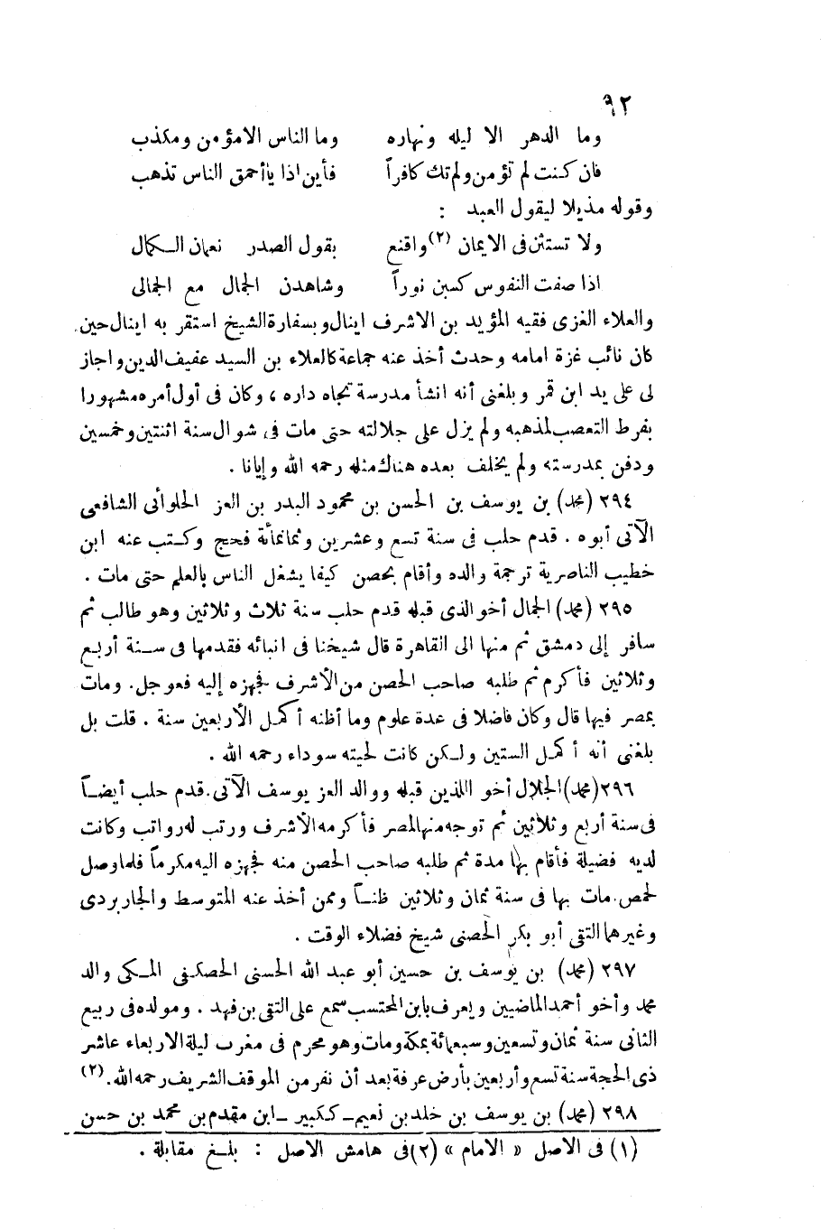 296 - مُحَمَّد الْجلَال / أَخُو اللَّذين قبله ووالد الْعِزّ وسف الْآتِي. قدم حلب أَيْضا فِي سنة أَربع وَثَلَاثِينَ ثمَّ توجه مِنْهَا لمصر فَأكْرمه الْأَشْرَف ورتب لَهُ رواتب وَكَانَت لَدَيْهِ فَضِيلَة فَأَقَامَ بهَا مُدَّة ثمَّ طلبه صَاحب الْحصن مِنْهُ فجهزه إِلَيْهِ مكرما فَلَمَّا وصل لحمص مَاتَ بهَا فِي سنة ثَمَان وَثَلَاثِينَ ظنا وَمِمَّنْ أَخذ عَنهُ الْمُتَوَسّط والجاربردي وَغَيرهمَا التقى أَبُو بكر الحصني شيخ)