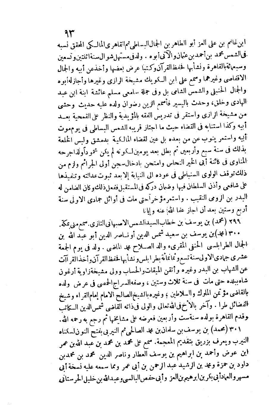 300 - مُحَمَّد بن يُوسُف بن سعيد شمس الدّين أَو نَاصِر الدّين أَبُو عبد الله بن الْجمال الطرابلسي الْحَنَفِيّ الْمُقْرِئ وَالِد الصّلاح مُحَمَّد الْمَاضِي. / ولد فِي يَوْم الْجُمُعَة عشرى جُمَادَى الأولى سنة تسع وَثَمَانمِائَة بطرابلس وَنَشَأ بهَا فحفظ الْقُرْآن وَأخذ القراآت عَن الشهَاب بن الْبَدْر وَغَيره وأتقن الْمِيقَات والحسان وَولي مشيخة زَاوِيَة أرغون شاه بِبَلَدِهِ حَتَّى مَاتَ فِي سنة ثَلَاث وَسِتِّينَ، وَصفه السراج الْحِمصِي فِي عرض وَلَده بِالْقَاضِي مؤتمن الْمُلُوك والسلاطين وَغَيره)