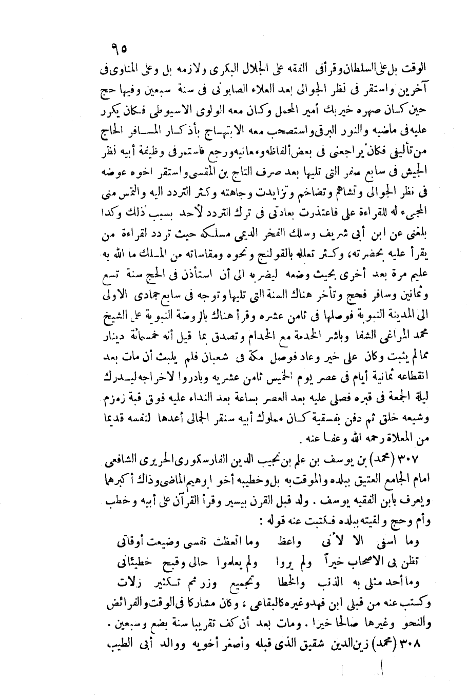 307 - مُحَمَّد بن يُوسُف بن علم بن نجيب الدّين الفارسكوري الحريري الشَّافِعِي / إِمَام الْجَامِع الْعَتِيق بِبَلَدِهِ والموقت بِهِ بل وخطيبه أَخُو إِبْرَهِيمُ الْمَاضِي وَذَاكَ أكبرهما وَيعرف بِابْن الْفَقِيه يُوسُف. ولد قبل القرين بِيَسِير وَقَرَأَ الْقُرْآن على أَبِيه وخطب وَأم وَحج ولقيته بِبَلَدِهِ فَكتبت عَنهُ قَوْله: