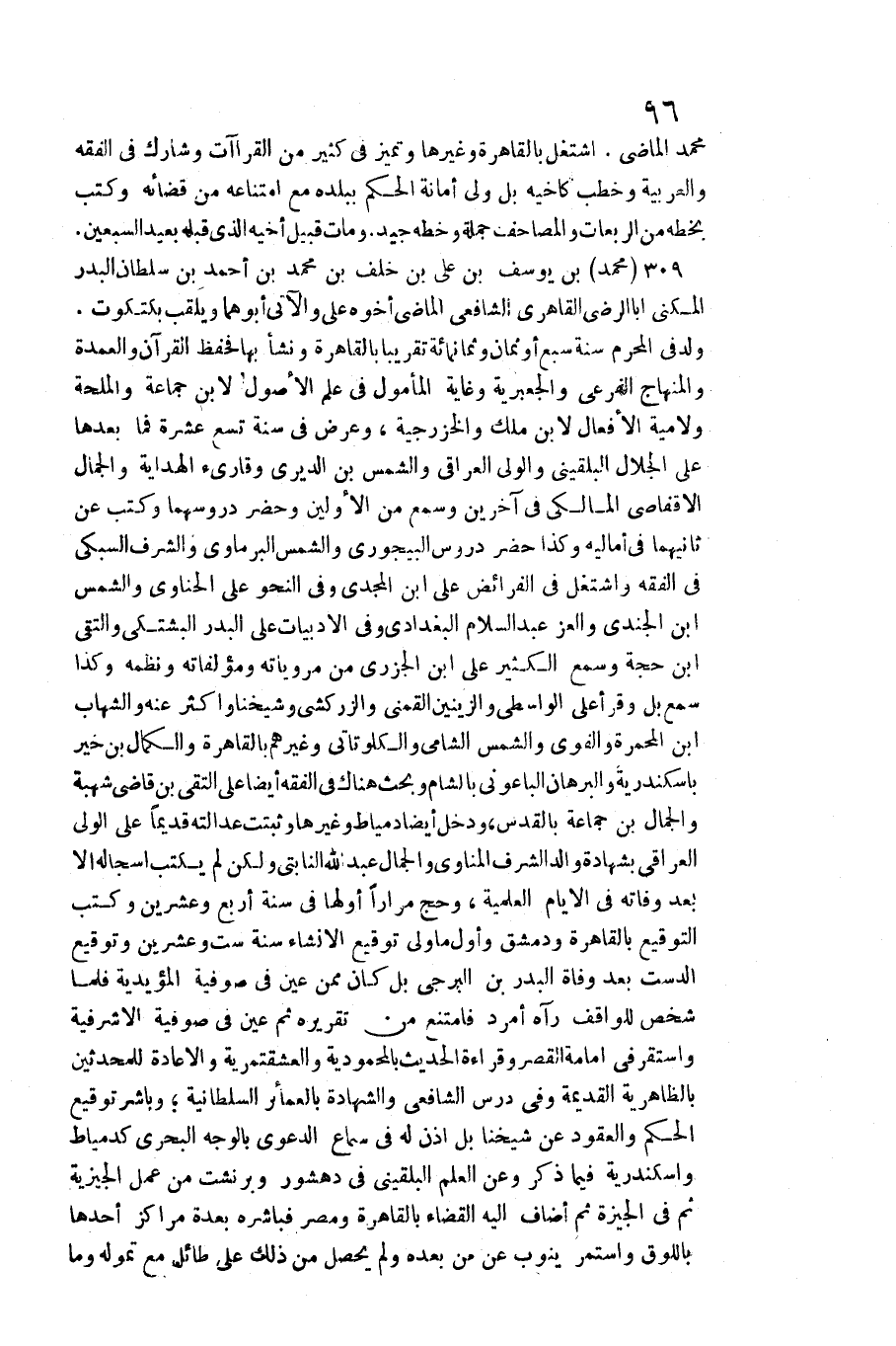 309 - مُحَمَّد بن يُوسُف بن عَليّ بن خلف بن مُحَمَّد بن أَحْمد بن سُلْطَان الْبَدْر المكني أَبَا الرضى القاهري الشَّافِعِي الْمَاضِي أَخُوهُ عَليّ والآتي أَبوهُمَا ويلقب بكتكوت. / ولد فِي الْمحرم سنة سبع أَو ثَمَان وَثَمَانمِائَة تَقْرِيبًا بِالْقَاهِرَةِ وَنَشَأ بهَا فحفظ الْقُرْآن والعمدة والمنهاج الفرعي والجعبرية وَغَايَة المأمول فِي علم الْأُصُول لِابْنِ جمَاعَة والملحة ولامية الْأَفْعَال لِابْنِ ملك والخزرجية، وَعرض فِي سنة تسع عشرَة فَمَا بعْدهَا على الْجلَال البُلْقِينِيّ وَالْوَلِيّ الْعِرَاقِيّ وَالشَّمْس بن الديري وقارئ الْهِدَايَة وَالْجمال الأقفاصي الْمَالِكِي فِي آخَرين وَسمع من الْأَوَّلين وَحضر دروسهما وَكتب عَن ثَانِيهمَا فِي أَمَالِيهِ وَكَذَا حضر دروس البيجوري وَالشَّمْس الْبرمَاوِيّ والشرف السُّبْكِيّ فِي الْفِقْه واشتغل فِي الْفَرَائِض على ابْن المجدي وَفِي النَّحْو على الحناوي وَالشَّمْس بن الجندي والعز عبد السَّلَام الْبَغْدَادِيّ وَفِي الأدبيات على الْبَدْر البشتكي والتقي بن حجَّة وَسمع الْكثير على ابْن الْجَزرِي من مروياته ومؤلفاته وتظمه وَكَذَا سمع بل وَقَرَأَ على الوَاسِطِيّ والزينين القمني وَالزَّرْكَشِيّ وَشَيخنَا وَأكْثر عَنهُ والشهاب بن المحمرة)
