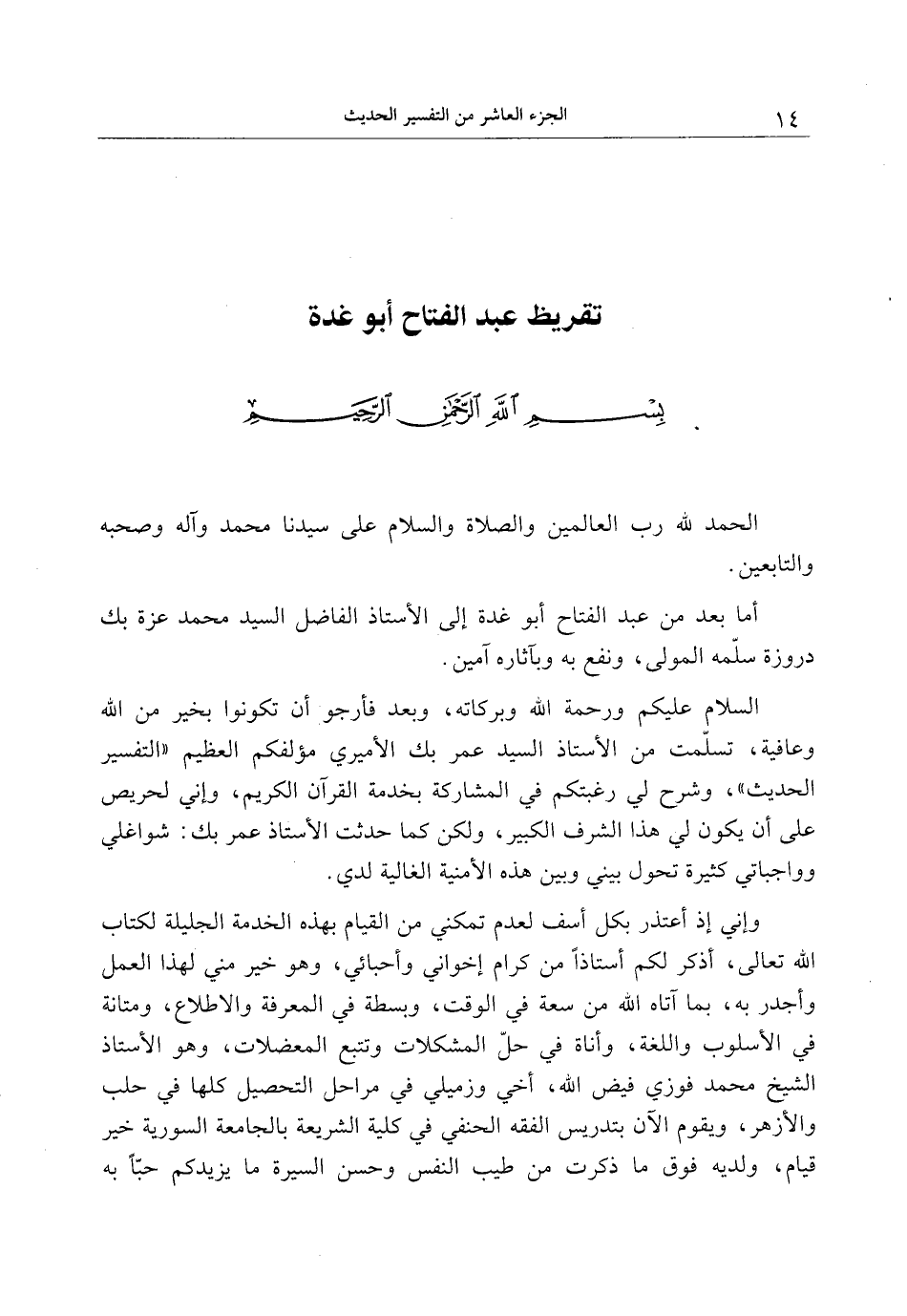 السلام عليكم ورحمة الله وبركاته، وبعد فأرجو أن تكونوا بخير من الله وعافية، تسلّمت من الأستاذ السيد عمر بك الأميري مؤلفكم العظيم «التفسير الحديث» ، وشرح لي رغبتكم في المشاركة بخدمة القرآن الكريم، وإني لحريص على أن يكون لي هذا الشرف الكبير، ولكن كما حدثت الأستاذ عمر بك: شواغلي وواجباتي كثيرة تحول بيني وبين هذه الأمنية الغالية لدي.