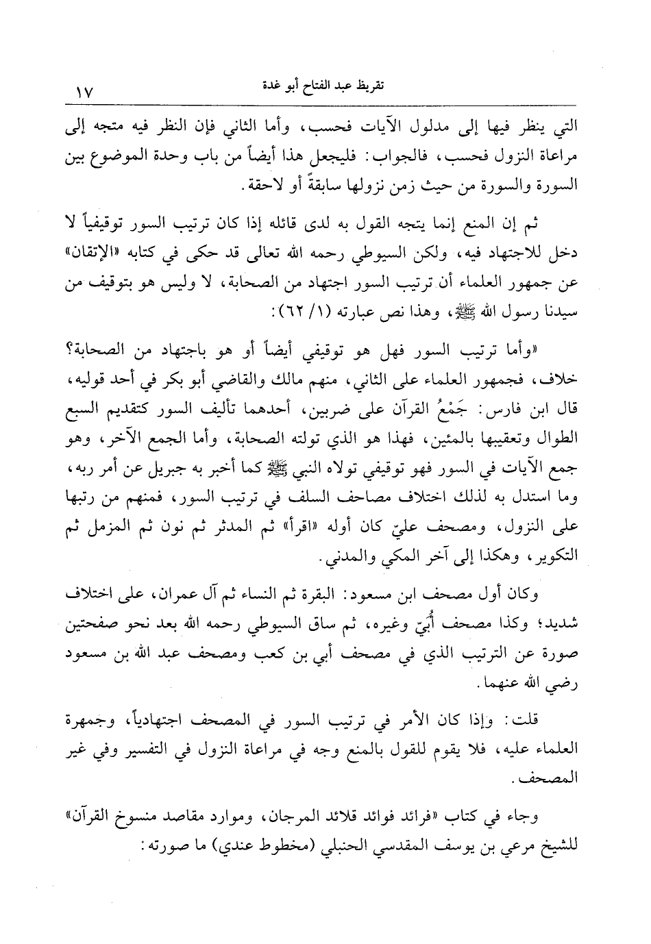ثم إن المنع إنما يتجه القول به لدى قائله إذا كان ترتيب السور توقيفيا لا دخل للاجتهاد فيه، ولكن السيوطي رحمه الله تعالى قد حكى في كتابه «الإتقان» عن جمهور العلماء أن ترتيب السور اجتهاد من الصحابة، لا وليس هو بتوقيف من سيدنا رسول الله صلى الله عليه وسلم، وهذا نص عبارته (1/ 62) :