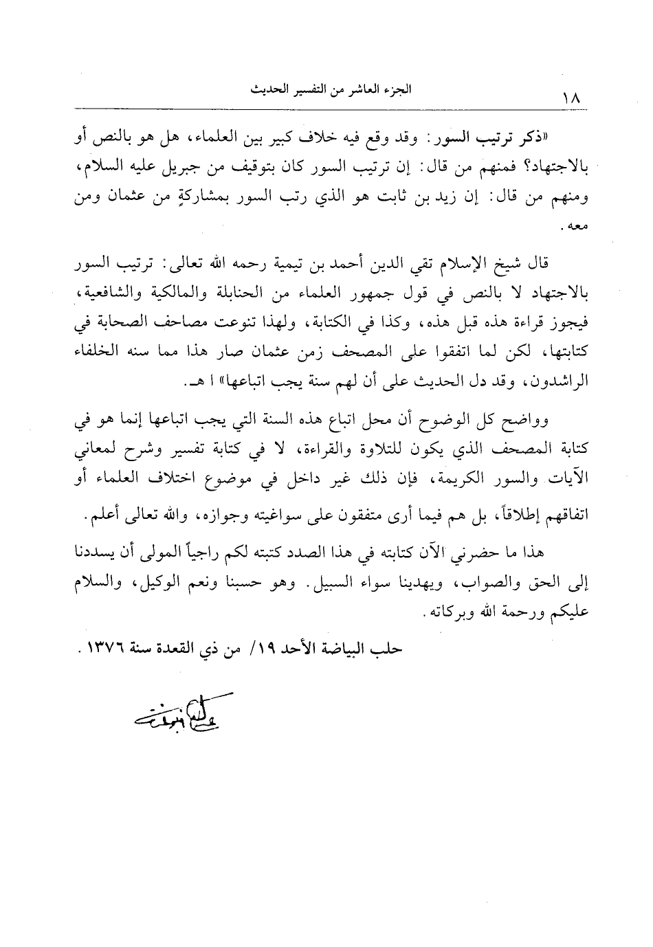 «ذكر ترتيب السور: وقد وقع فيه خلاف كبير بين العلماء، هل هو بالنص أو بالاجتهاد؟ فمنهم من قال: إن ترتيب السور كان بتوقيف من جبريل عليه السلام، ومنهم من قال: إن زيد بن ثابت هو الذي رتب السور بمشاركة من عثمان ومن معه.