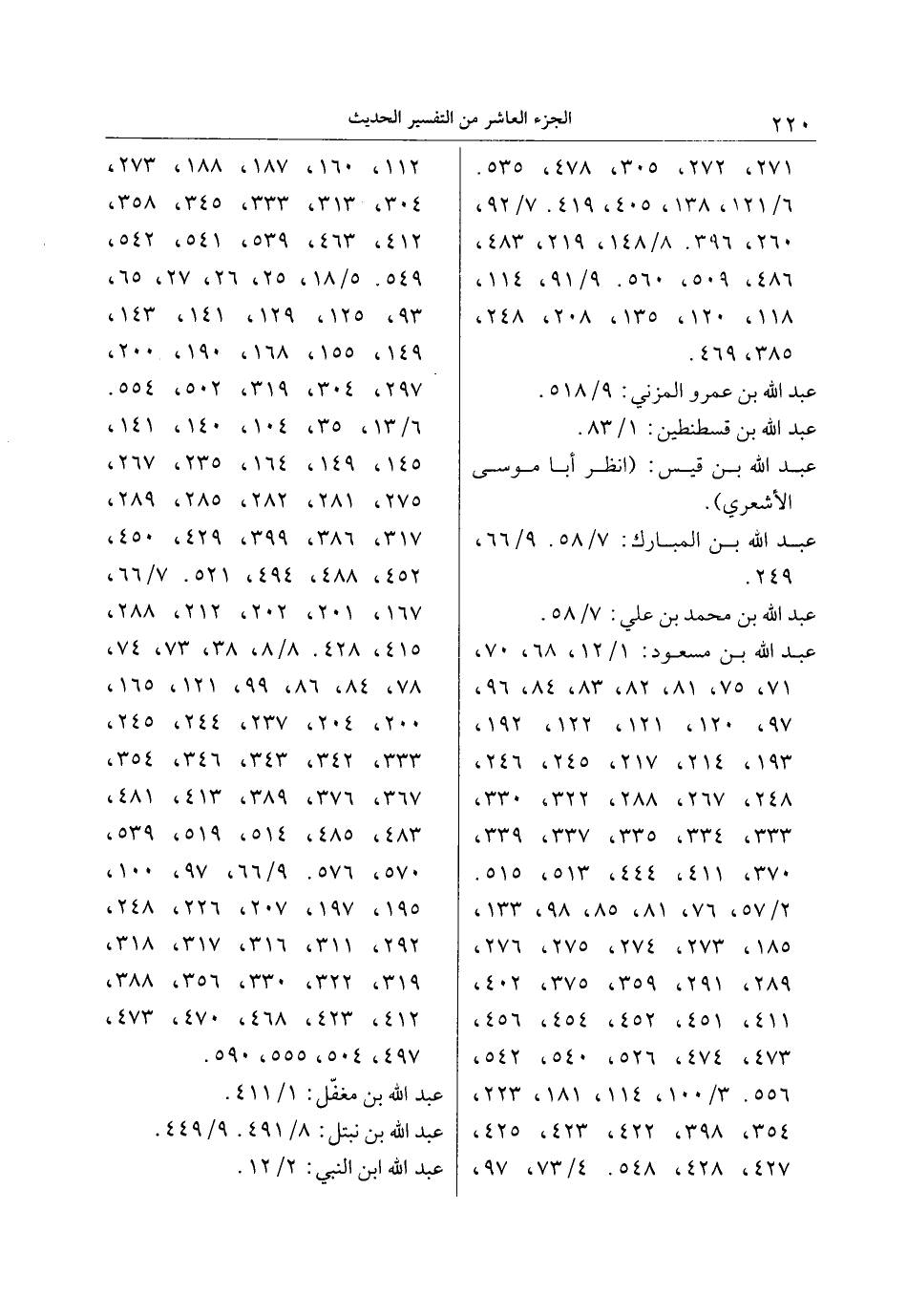 عبد الله بن مسعود: 1/ 12، 68، 70، 71، 75، 81، 82، 83، 84، 96، 97، 120، 121، 122، 192، 193، 214، 217، 245، 246، 248، 267، 288، 322، 330، 333، 334، 335، 337، 339، 370، 411، 444، 513، 515.