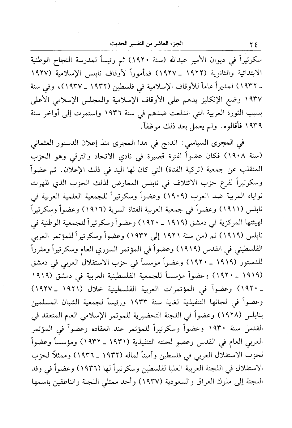 في المجرى السياسي: اندمج في هذا المجرى منذ إعلان الدستور العثماني (سنة 1908) فكان عضوا لفترة قصيرة في نادي الاتحاد والترقي وهو الحزب المنقلب عن جمعية (تركية الفتاة) التي كان لها اليد في ذلك الإعلان. ثم عضوا وسكرتيرا لفرع حزب الائتلاف في نابلس المعارض لذلك الحزب الذي ظهرت نواياه المريبة ضد العرب (1909) وعضوا وسكرتيرا للجمعية العلمية العربية في نابلس (1911) وعضوا في جمعية العربية الفتاة السرية (1916) وعضوا وسكرتيرا لهيئتها المركزية في دمشق (1919- 1920) وعضوا وسكرتيرا للجمعية الوطنية في نابلس (1919) ثم (من سنة 1921 إلى 1932) وعضوا وسكرتيرا للمؤتمر العربي الفلسطيني في القدس (1919) وعضوا في المؤتمر السوري العام وسكرتيرا ومقررا للدستور (1919- 1920) وعضوا مؤسسا في حزب الاستقلال العربي في دمشق (1919- 1920) وعضوا مؤسسا للجمعية الفلسطينية العربية في دمشق (1919- 1920) وعضوا في المؤتمرات العربية الفلسطينية خلال (1921- 1927) وعضوا في لجانها التنفيذية لغاية سنة 1933 ورئيسا لجمعية الشبان المسلمين بنابلس (1928) وعضوا في اللجنة التحضيرية للمؤتمر الإسلامي العام المنعقد في القدس سنة 1930 وعضوا وسكرتيرا للمؤتمر عند انعقاده وعضوا في المؤتمر العربي العام في القدس وعضو لجنته التنفيذية (1931- 1932) ومؤسسا وعضوا لحزب الاستقلال العربي في فلسطين وأمينا لماله (1932- 1936) وممثلا لحزب الاستقلال في اللجنة العربية العليا لفلسطين وسكرتيرا لها (1936) وعضوا في وفد اللجنة إلى ملوك العراق والسعودية (1937) وأحد ممثلي اللجنة والناطقين باسمها
