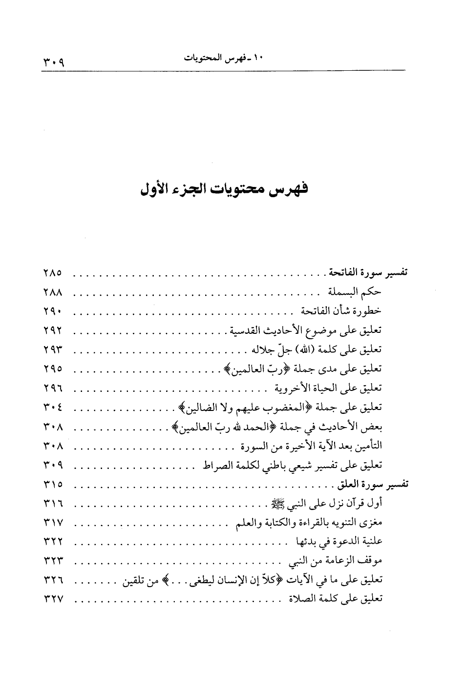 تفسير سورة الفاتحة 285 حكم البسملة 288 خطورة شأن الفاتحة 290 تعليق على موضوع الأحاديث القدسية 292 تعليق على كلمة (الله) جلّ جلاله 293 تعليق على مدى جملة رَبِّ الْعالَمِينَ 295 تعليق على الحياة الأخروية 296 تعليق على جملة الْمَغْضُوبِ عَلَيْهِمْ وَلَا الضَّالِّينَ 304 بعض الأحاديث في جملة الْحَمْدُ لِلَّهِ رَبِّ الْعالَمِينَ 308 التأمين بعد الآية الأخيرة من السورة 308 تعليق على تفسير شيعي باطني لكلمة الصراط 309 تفسير سورة العلق 315 أول قرآن نزل على النبي صلّى الله عليه وسلم 316 مغزى التنويه بالقراءة والكتابة والعلم 317 علنية الدعوة في بدئها 322 موقف الزعامة من النبي 323 تعليق على ما في الآيات كَلَّا إِنَّ الْإِنْسانَ لَيَطْغى ... من تلقين 326 تعليق على كلمة الصلاة 327