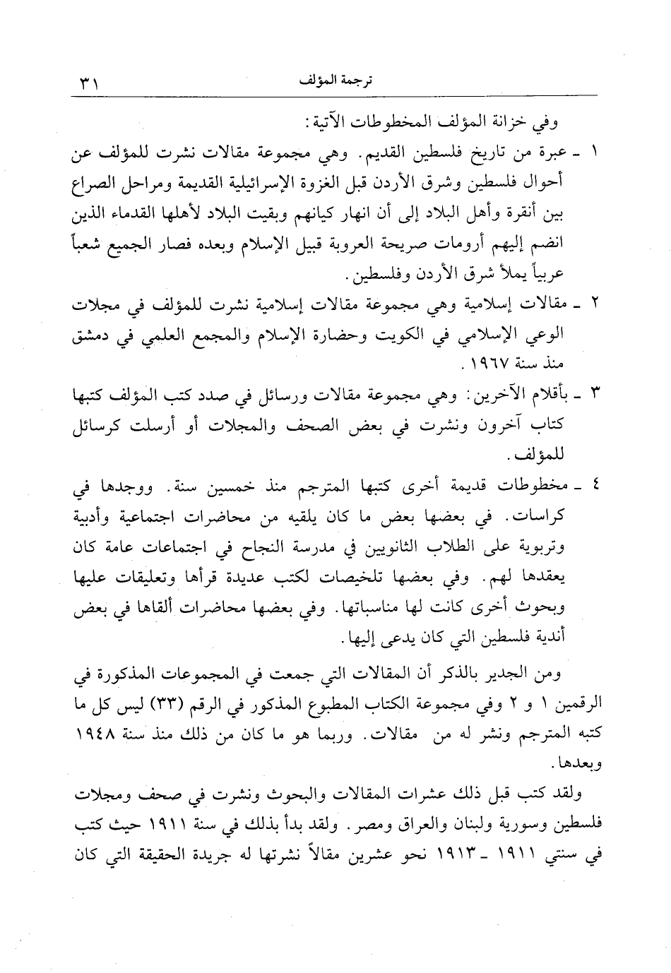 4- مخطوطات قديمة أخرى كتبها المترجم منذ خمسين سنة. ووجدها في كراسات. في بعضها بعض ما كان يلقيه من محاضرات اجتماعية وأدبية وتربوية على الطلاب الثانويين في مدرسة النجاح في اجتماعات عامة كان يعقدها لهم. وفي بعضها تلخيصات لكتب عديدة قرأها وتعليقات عليها وبحوث أخرى كانت لها مناسباتها. وفي بعضها محاضرات ألقاها في بعض أندية فلسطين التي كان يدعى إليها.
