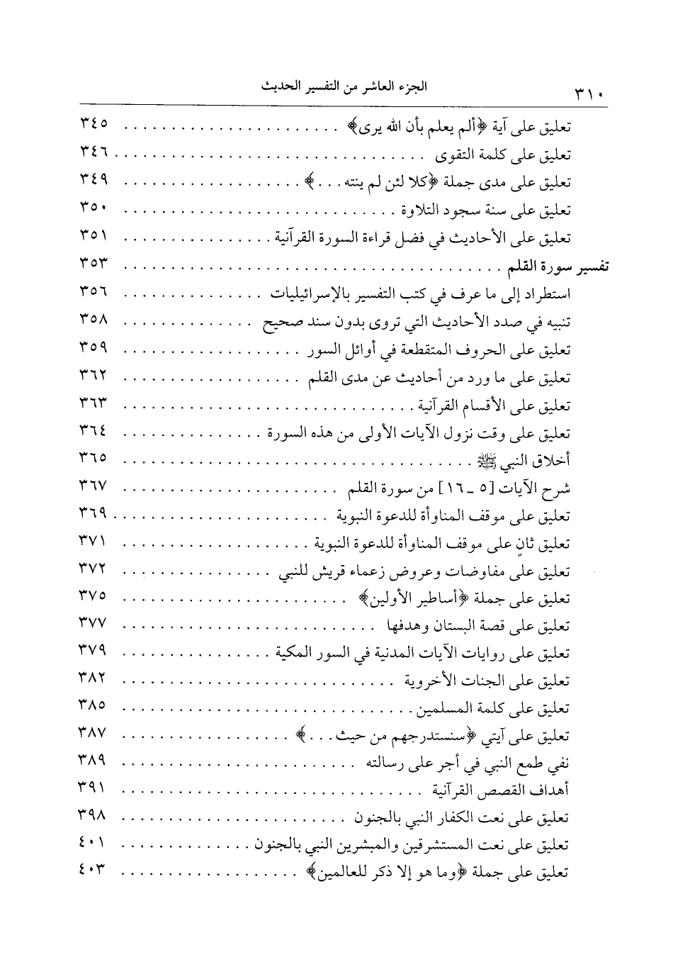 نفي طمع النبي في أجر على رسالته 389 أهداف القصص القرآنية 391 تعليق على نعت الكفار النبي بالجنون 398 تعليق على نعت المستشرقين والمبشرين النبي بالجنون 401 تعليق على جملة وَما هُوَ إِلَّا ذِكْرٌ لِلْعالَمِينَ 403