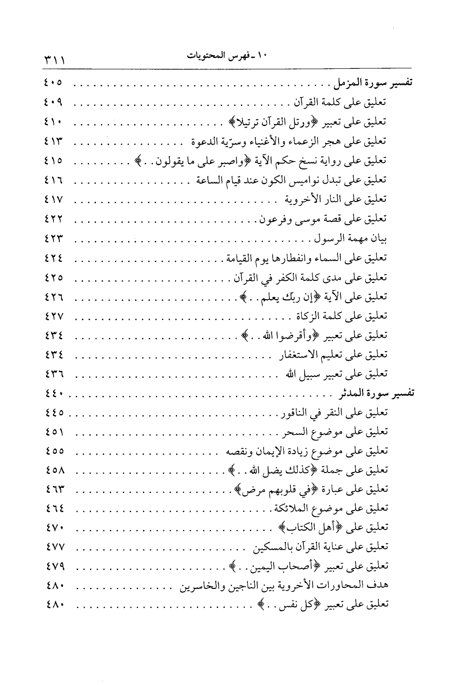 تعليق على تبدل نواميس الكون عند قيام الساعة 416 تعليق على النار الأخروية 417 تعليق على قصة موسى وفرعون 422 بيان مهمة الرسول 423 تعليق على السماء وانفطارها يوم القيامة 424 تعليق على مدى كلمة الكفر في القرآن 425 تعليق على الآية إِنَّ رَبَّكَ يَعْلَمُ.. 426