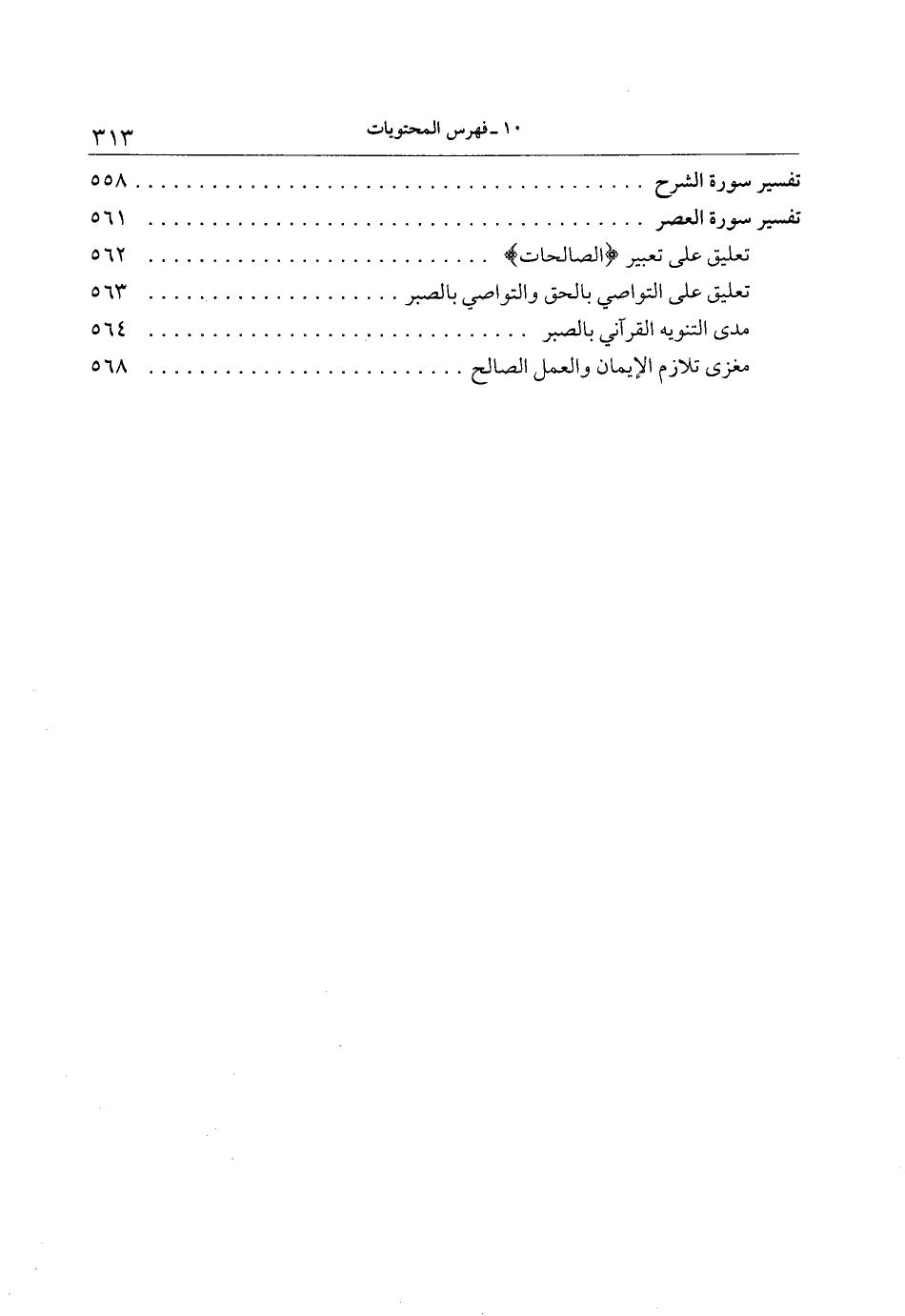 تفسير سورة الشرح 558 تفسير سورة العصر 561 تعليق على تعبير الصَّالِحاتِ 562 تعليق على التواصي بالحق والتواصي بالصبر 563 مدى التنويه القرآني بالصبر 564 مغزى تلازم الإيمان والعمل الصالح 568