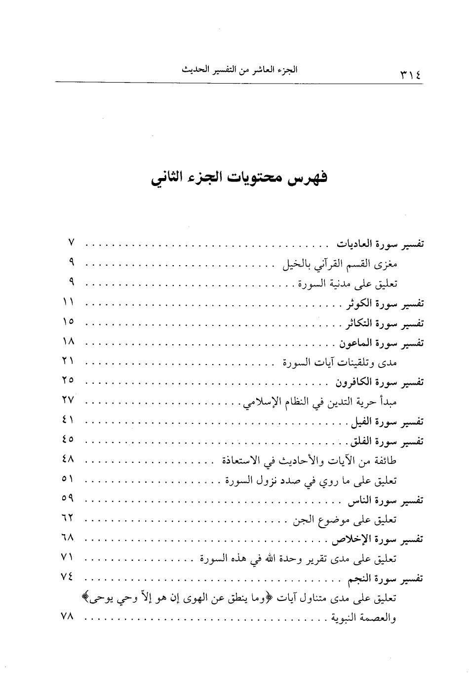 تفسير سورة العاديات 7 مغزى القسم القرآني بالخيل 9 تعليق على مدنية السورة 9 تفسير سورة الكوثر 11 تفسير سورة التكاثر 15 تفسير سورة الماعون 18 مدى وتلقينات آيات السورة 21 تفسير سورة الكافرون 25 مبدأ حرية التدين في النظام الإسلامي 27 تفسير سورة الفيل 41 تفسير سورة الفلق 45 طائفة من الآيات والأحاديث في الاستعاذة 48 تعليق على ما روي في صدد نزول السورة 51 تفسير سورة الناس 59 تعليق على موضوع الجن 62 تفسير سورة الإخلاص 68 تعليق على مدى تقرير وحدة الله في هذه السورة 71 تفسير سورة النجم 74 تعليق على مدى متناول آيات وَما يَنْطِقُ عَنِ الْهَوى إِنْ هُوَ إِلَّا وَحْيٌ يُوحى والعصمة النبوية 78