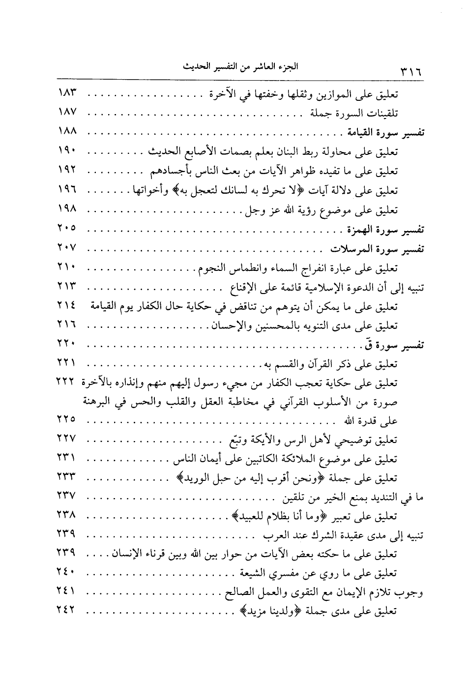 تعليق على الموازين وثقلها وخفتها في الآخرة 183 تلقينات السورة جملة 187 تفسير سورة القيامة 188 تعليق على محاولة ربط البنان بعلم بصمات الأصابع الحديث 190 تعليق على ما تفيده ظواهر الآيات من بعث الناس بأجسادهم 192 تعليق على دلالة آيات لا تُحَرِّكْ بِهِ لِسانَكَ لِتَعْجَلَ بِهِ