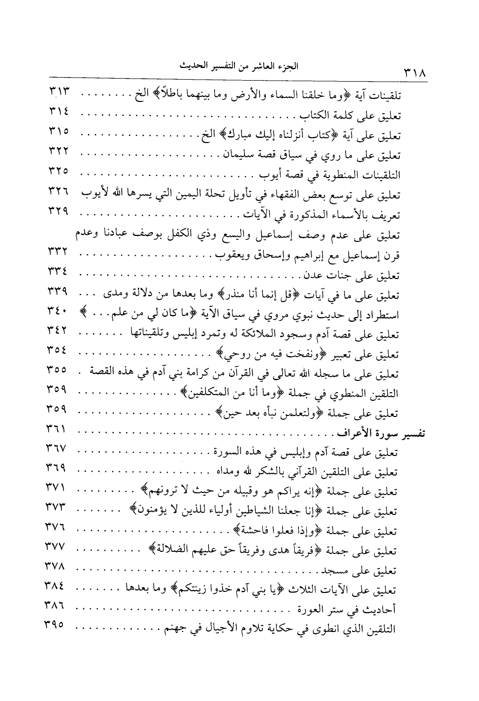 تلقينات آية وَما خَلَقْنَا السَّماءَ وَالْأَرْضَ وَما بَيْنَهُما باطِلًا إلخ 313 تعليق على كلمة الكتاب 314 تعليق على آية كِتابٌ أَنْزَلْناهُ إِلَيْكَ مُبارَكٌ إلخ 315 تعليق على ما روي في سياق قصة سليمان 322 التلقينات المنطوية في قصة أيوب 325 تعليق على توسع بعض الفقهاء في تأويل تحلة اليمين التي يسرها الله لأيوب 326 تعريف بالأسماء المذكورة في الآيات 329 تعليق على عدم وصف إسماعيل واليسع وذي الكفل بوصف عبادنا وعدم قرن إسماعيل مع إبراهيم وإسحاق ويعقوب 332 تعليق على جنات عدن 334 تعليق على ما في آيات قُلْ إِنَّما أَنَا مُنْذِرٌ وما بعدها من دلالة ومدى 339 استطراد إلى حديث نبوي مروي في سياق الآية ما كانَ لِي مِنْ عِلْمٍ ... 340