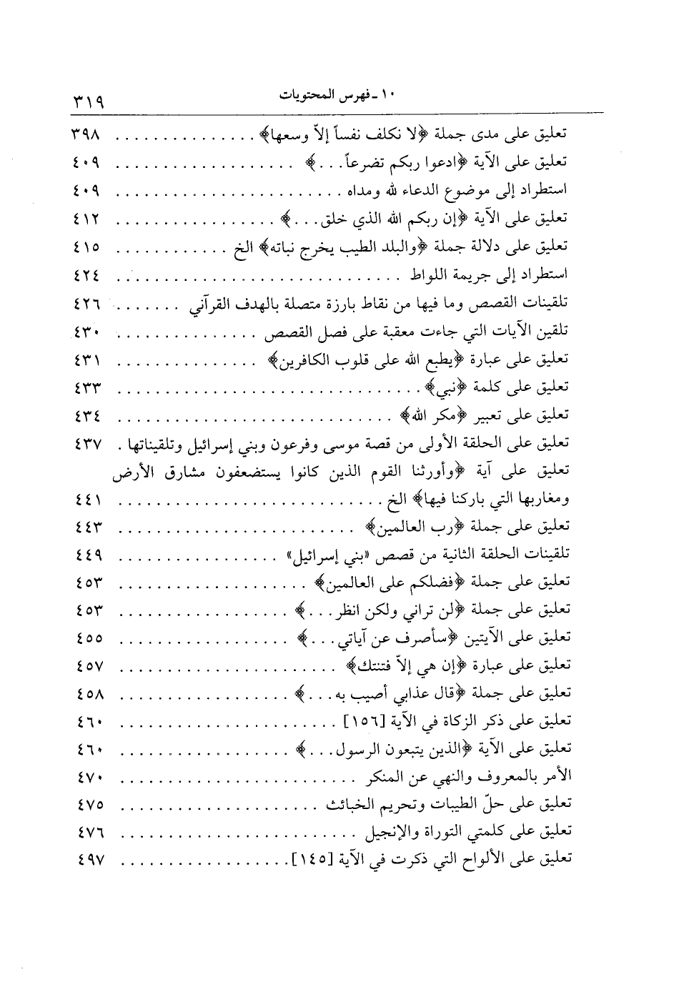 الأمر بالمعروف والنهي عن المنكر 470 تعليق على حلّ الطيبات وتحريم الخبائث 475 تعليق على كلمتي التوراة والإنجيل 476 تعليق على الألواح التي ذكرت في الآية [145] 497