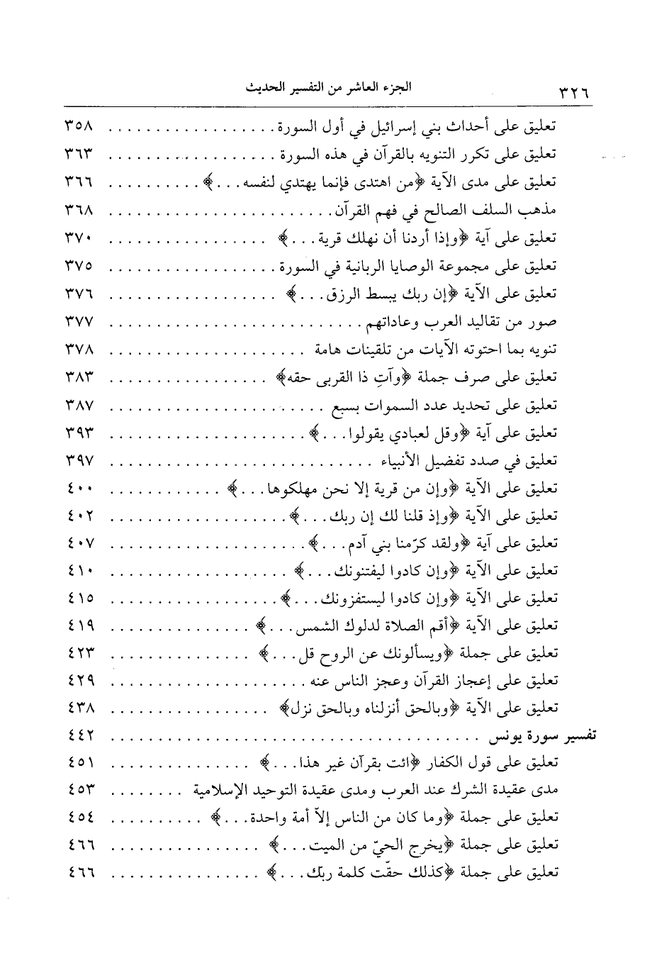 تعليق على أحداث بني إسرائيل في أول السورة 358 تعليق على تكرر التنويه بالقرآن في هذه السورة 363 تعليق على مدى الآية مَنِ اهْتَدى فَإِنَّما يَهْتَدِي لِنَفْسِهِ ... 366