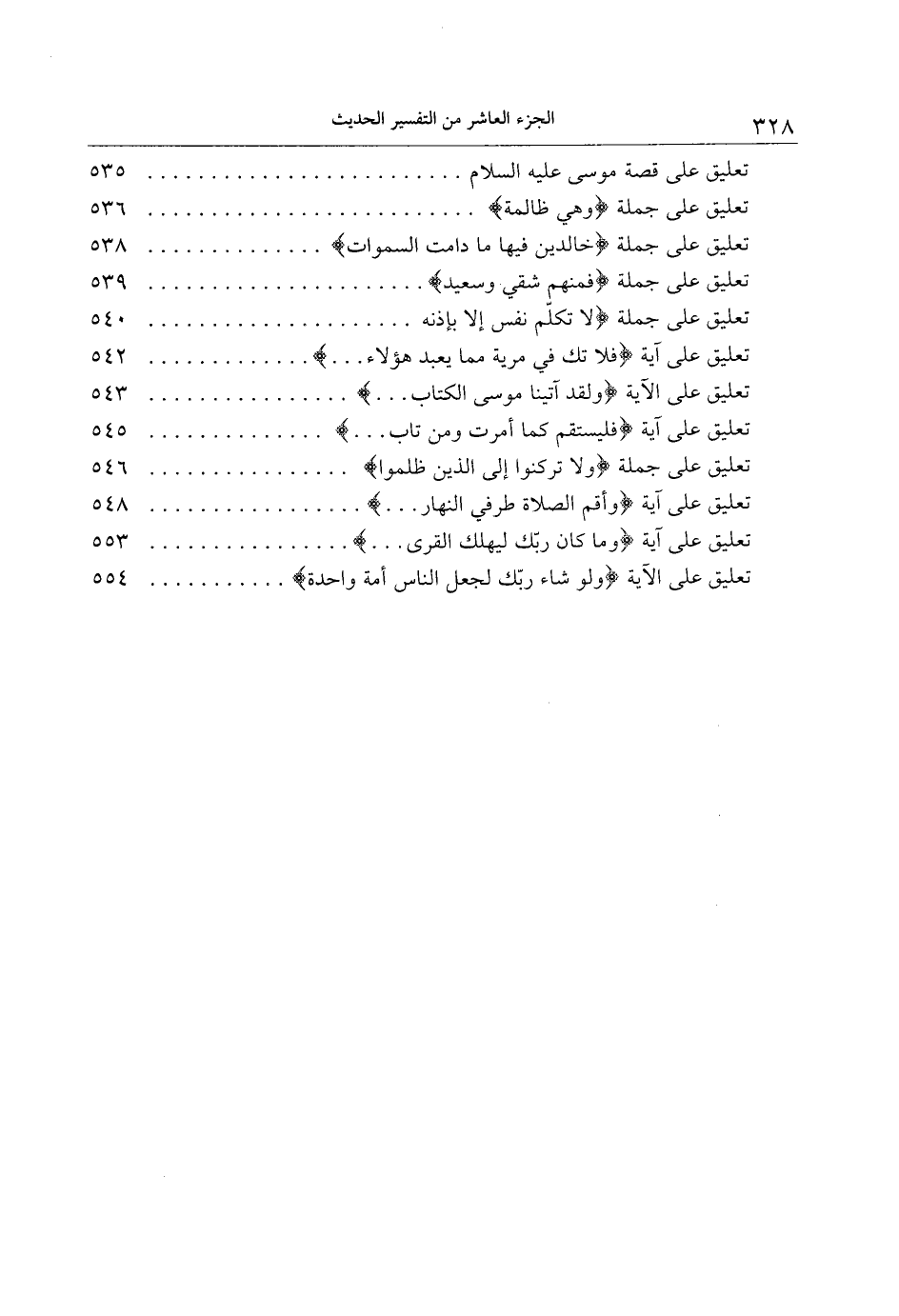 تعليق على قصة موسى عليه السلام 535 تعليق على جملة وَهِيَ ظالِمَةٌ 536 تعليق على جملة خالِدِينَ فِيها ما دامَتِ السَّماواتُ 538 تعليق على جملة فَمِنْهُمْ شَقِيٌّ وَسَعِيدٌ 539 تعليق على جملة لا تَكَلَّمُ نَفْسٌ إِلَّا بِإِذْنِهِ 540 تعليق على آية فَلا تَكُ فِي مِرْيَةٍ مِمَّا يَعْبُدُ هؤُلاءِ ... 542