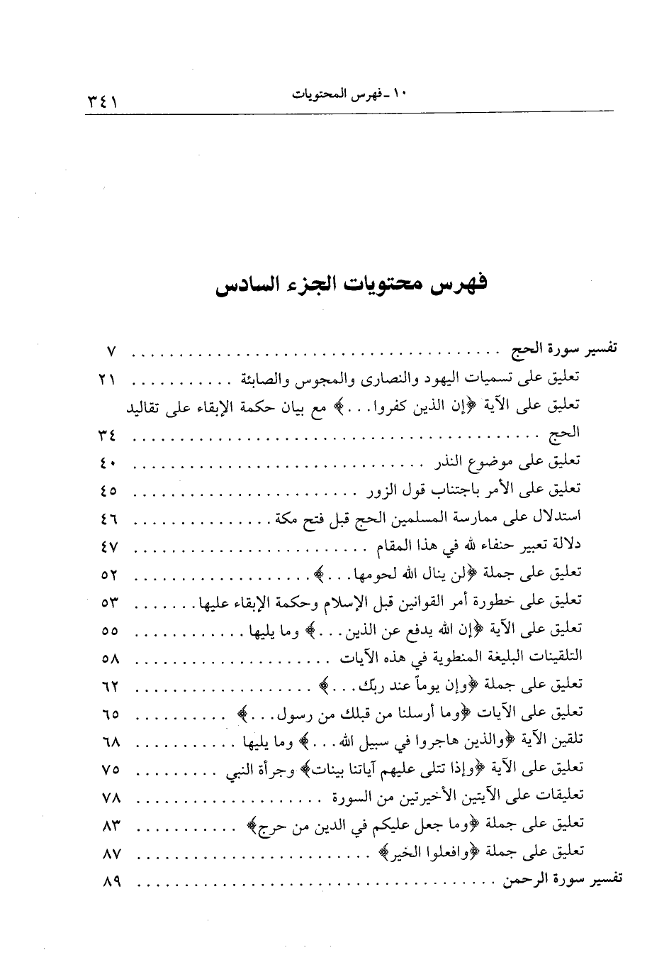 تفسير سورة الحج 7 تعليق على تسميات اليهود والنصارى والمجوس والصابئة 21 تعليق على الآية إِنَّ الَّذِينَ كَفَرُوا ... مع بيان حكمة الإبقاء على تقاليد الحج 34 تعليق على موضوع النذر 40 تعليق على الأمر باجتناب قول الزور 45 استدلال على ممارسة المسلمين الحج قبل فتح مكة 46 دلالة تعبير حنفاء لله في هذا المقام 47 تعليق على جملة لَنْ يَنالَ اللَّهَ لُحُومُها ... 52