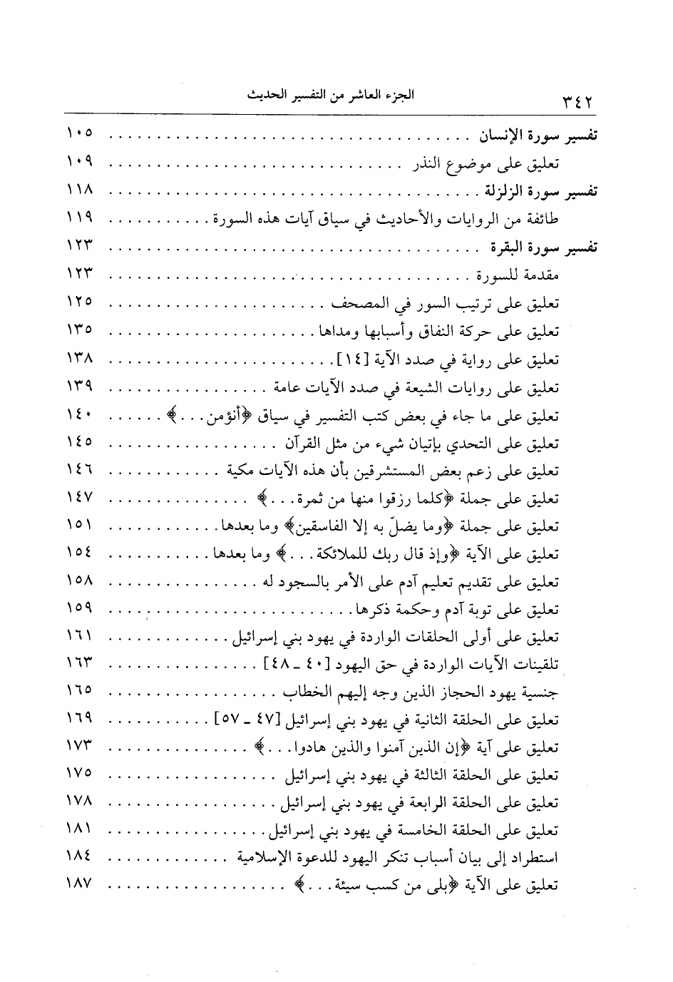 تفسير سورة الإنسان 105 تعليق على موضوع النذر 109 تفسير سورة الزلزلة 118 طائفة من الروايات والأحاديث في سياق آيات هذه السورة 119 تفسير سورة البقرة 123 مقدمة للسورة 123 تعليق على ترتيب السور في المصحف 125 تعليق على حركة النفاق وأسبابها ومداها 135 تعليق على رواية في صدد الآية [14] 138 تعليق على روايات الشيعة في صدد الآيات عامة 139 تعليق على ما جاء في بعض كتب التفسير في سياق أَنُؤْمِنُ ... 140