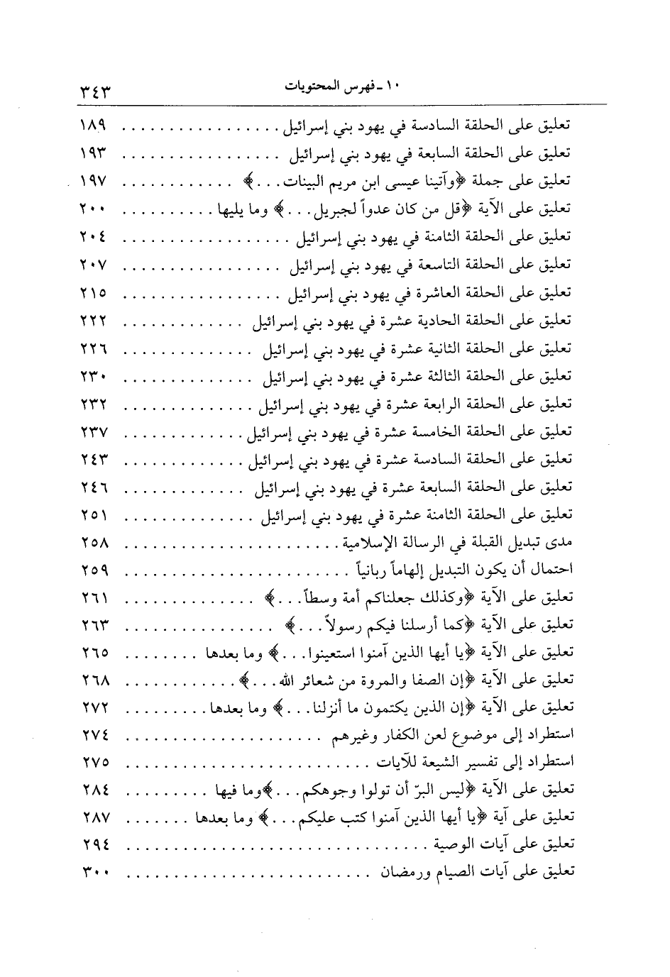 تعليق على الآية إِنَّ الَّذِينَ يَكْتُمُونَ ما أَنْزَلْنا ... وما بعدها 272 استطراد إلى موضوع لعن الكفار وغيرهم 274 استطراد إلى تفسير الشيعة للآيات 275 تعليق على الآية لَيْسَ الْبِرَّ أَنْ تُوَلُّوا وُجُوهَكُمْ ... وما فيها 284 تعليق على آية يا أَيُّهَا الَّذِينَ آمَنُوا كُتِبَ عَلَيْكُمُ ... وما بعدها 287 تعليق على آيات الوصية 294 تعليق على آيات الصيام ورمضان 300