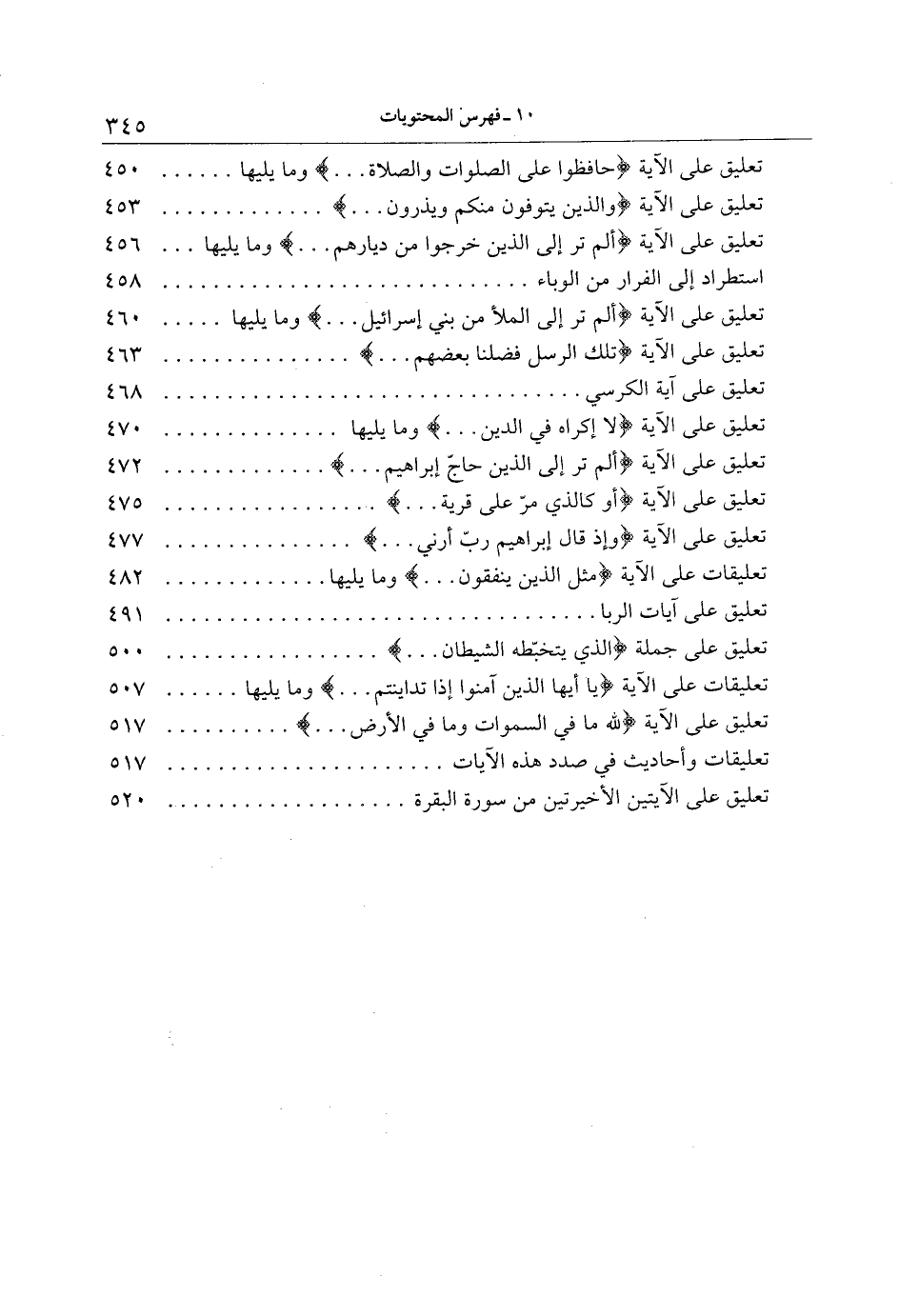 تعليق على الآية أَلَمْ تَرَ إِلَى الَّذِينَ خَرَجُوا مِنْ دِيارِهِمْ ... وما يليها 456 استطراد إلى الفرار من الوباء 458 تعليق على الآية أَلَمْ تَرَ إِلَى الْمَلَإِ مِنْ بَنِي إِسْرائِيلَ ... وما يليها 460 تعليق على الآية تِلْكَ الرُّسُلُ فَضَّلْنا بَعْضَهُمْ ... 463