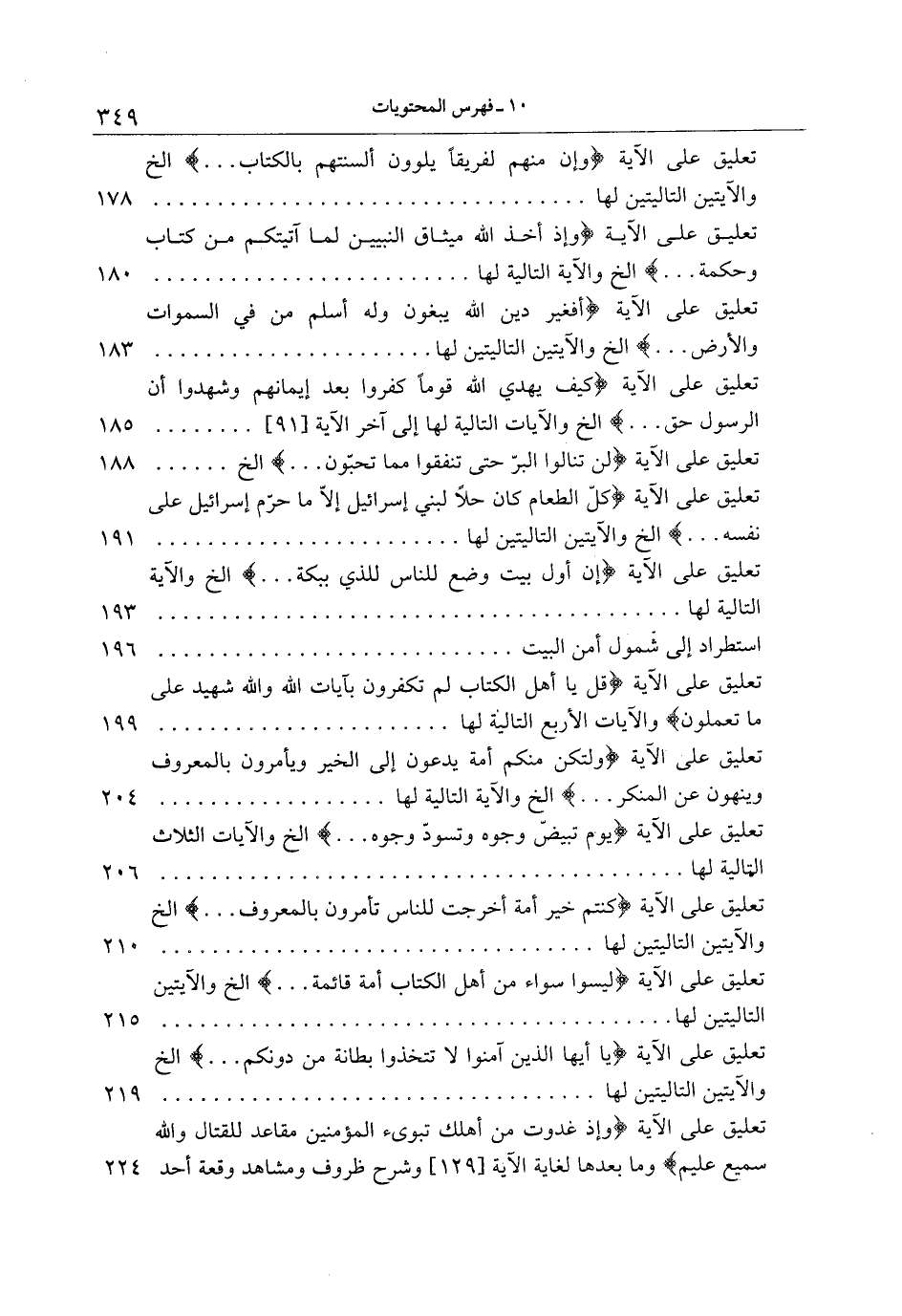 إلخ والآيات التالية لها إلى آخر الآية [91] 185 تعليق على الآية لَنْ تَنالُوا الْبِرَّ حَتَّى تُنْفِقُوا مِمَّا تُحِبُّونَ ... إلخ 188 تعليق على الآية كُلُّ الطَّعامِ كانَ حِلًّا لِبَنِي إِسْرائِيلَ إِلَّا ما حَرَّمَ إِسْرائِيلُ عَلى نَفْسِهِ ... إلخ والآيتين التاليتين لها 191 تعليق على الآية إِنَّ أَوَّلَ بَيْتٍ وُضِعَ لِلنَّاسِ لَلَّذِي بِبَكَّةَ ... إلخ والآية التالية لها 193 استطراد إلى شمول أمن البيت 196 تعليق على الآية قُلْ يا أَهْلَ الْكِتابِ لِمَ تَكْفُرُونَ بِآياتِ اللَّهِ وَاللَّهُ شَهِيدٌ عَلى ما تَعْمَلُونَ والآيات الأربع التالية لها 199 تعليق على الآية وَلْتَكُنْ مِنْكُمْ أُمَّةٌ يَدْعُونَ إِلَى الْخَيْرِ وَيَأْمُرُونَ بِالْمَعْرُوفِ وَيَنْهَوْنَ عَنِ الْمُنْكَرِ ... إلخ والآية التالية لها 204 تعليق على الآية يَوْمَ تَبْيَضُّ وُجُوهٌ وَتَسْوَدُّ وُجُوهٌ ... إلخ والآيات الثلاث التالية لها 206 تعليق على الآية كُنْتُمْ خَيْرَ أُمَّةٍ أُخْرِجَتْ لِلنَّاسِ تَأْمُرُونَ بِالْمَعْرُوفِ ... إلخ والآيتين التاليتين لها 210 تعليق على الآية لَيْسُوا سَواءً مِنْ أَهْلِ الْكِتابِ أُمَّةٌ قائِمَةٌ ... إلخ والآيتين التاليتين لها 215 تعليق على الآية يا أَيُّهَا الَّذِينَ آمَنُوا لا تَتَّخِذُوا بِطانَةً مِنْ دُونِكُمْ ... إلخ والآيتين التاليتين لها 219 تعليق على الآية وَإِذْ غَدَوْتَ مِنْ أَهْلِكَ تُبَوِّئُ الْمُؤْمِنِينَ مَقاعِدَ لِلْقِتالِ وَاللَّهُ سَمِيعٌ عَلِيمٌ وما بعدها لغاية الآية [129] وشرح ظروف ومشاهد وقعة أحد 224