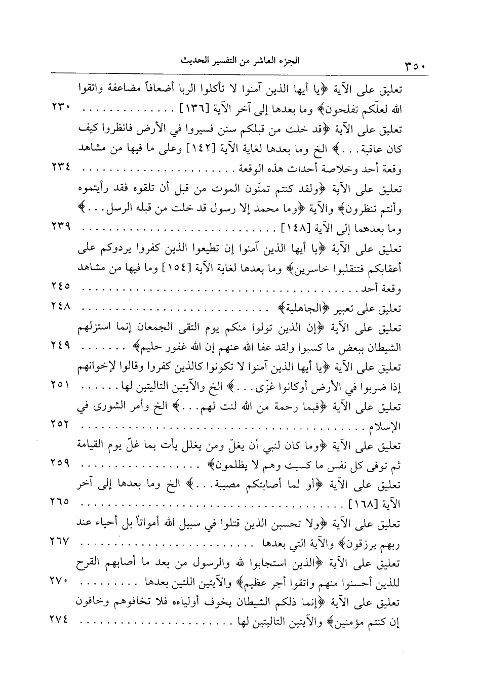 وما بعدهما إلى الآية [148] 239 تعليق على الآية يا أَيُّهَا الَّذِينَ آمَنُوا إِنْ تُطِيعُوا الَّذِينَ كَفَرُوا يَرُدُّوكُمْ عَلى أَعْقابِكُمْ فَتَنْقَلِبُوا خاسِرِينَ وما بعدها لغاية الآية [154] وما فيها من مشاهد وقعة أحد 245 تعليق على تعبير الْجاهِلِيَّةِ 248 تعليق على الآية إِنَّ الَّذِينَ تَوَلَّوْا مِنْكُمْ يَوْمَ الْتَقَى الْجَمْعانِ إِنَّمَا اسْتَزَلَّهُمُ الشَّيْطانُ بِبَعْضِ ما كَسَبُوا وَلَقَدْ عَفَا اللَّهُ عَنْهُمْ إِنَّ اللَّهَ غَفُورٌ حَلِيمٌ 249 تعليق على الآية يا أَيُّهَا الَّذِينَ آمَنُوا لا تَكُونُوا كَالَّذِينَ كَفَرُوا وَقالُوا لِإِخْوانِهِمْ إِذا ضَرَبُوا فِي الْأَرْضِ أَوْ كانُوا غُزًّى ... إلخ والآيتين التاليتين لها 251 تعليق على الآية فَبِما رَحْمَةٍ مِنَ اللَّهِ لِنْتَ لَهُمْ ... إلخ وأمر الشورى في الإسلام 252 تعليق على الآية وَما كانَ لِنَبِيٍّ أَنْ يَغُلَّ وَمَنْ يَغْلُلْ يَأْتِ بِما غَلَّ يَوْمَ الْقِيامَةِ ثُمَّ تُوَفَّى كُلُّ نَفْسٍ ما كَسَبَتْ وَهُمْ لا يُظْلَمُونَ 259 تعليق على الآية أَوَلَمَّا أَصابَتْكُمْ مُصِيبَةٌ ... إلخ وما بعدها إلى آخر الآية [168] 265 تعليق على الآية وَلا تَحْسَبَنَّ الَّذِينَ قُتِلُوا فِي سَبِيلِ اللَّهِ أَمْواتاً بَلْ أَحْياءٌ عِنْدَ رَبِّهِمْ يُرْزَقُونَ والآية التي بعدها 267 تعليق على الآية الَّذِينَ اسْتَجابُوا لِلَّهِ وَالرَّسُولِ مِنْ بَعْدِ ما أَصابَهُمُ الْقَرْحُ لِلَّذِينَ أَحْسَنُوا مِنْهُمْ وَاتَّقَوْا أَجْرٌ عَظِيمٌ والآيتين اللتين بعدها 270 تعليق على الآية إِنَّما ذلِكُمُ الشَّيْطانُ يُخَوِّفُ أَوْلِياءَهُ فَلا تَخافُوهُمْ وَخافُونِ إِنْ كُنْتُمْ مُؤْمِنِينَ والآيتين التاليتين لها 274