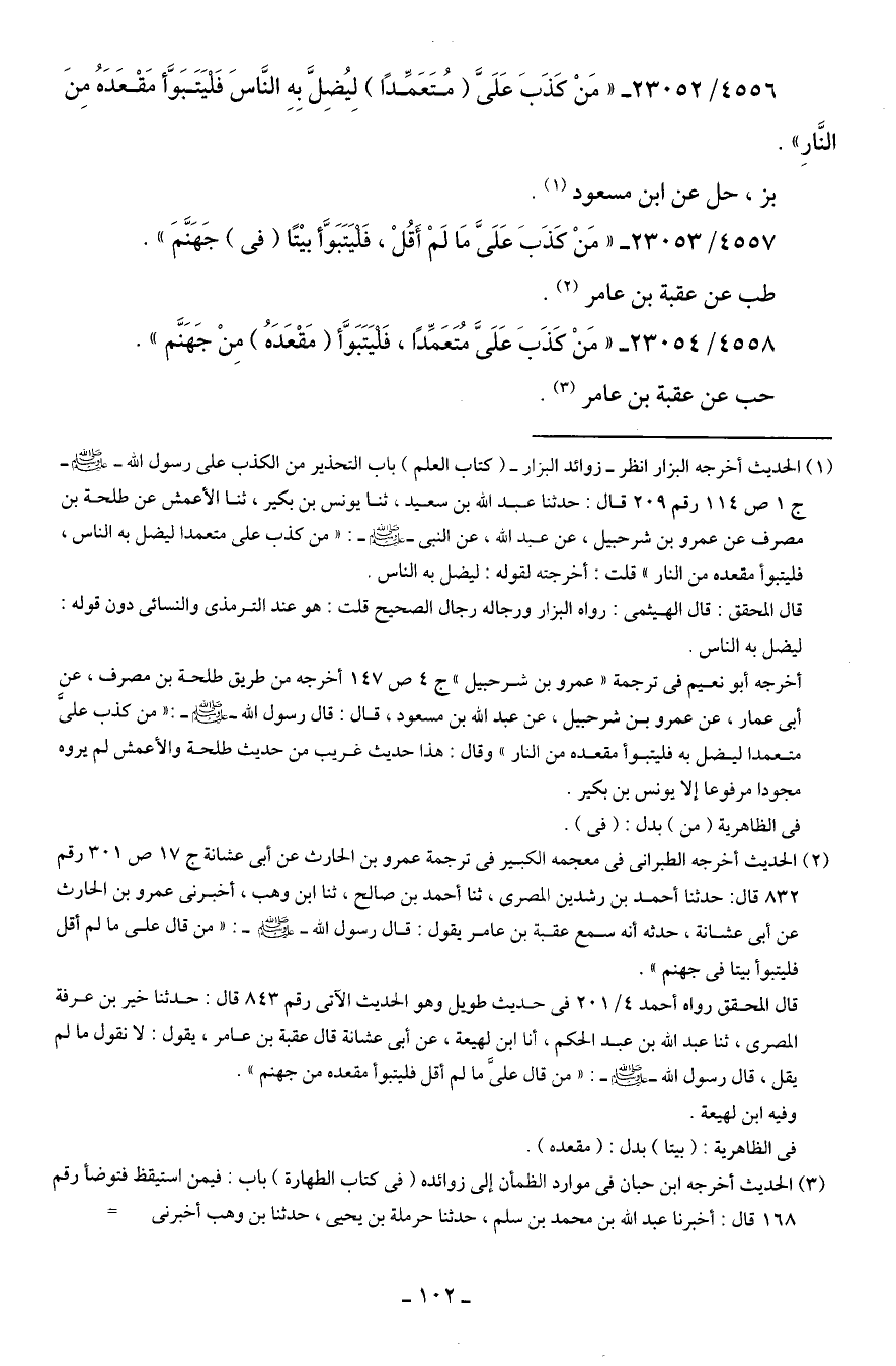 4556/ 23052 - "مَنْ كَذَبَ عَلَيَّ (مُتَعَمِّدًا) لِيُضِلَّ بِهِ النَّاسَ فَليَتبَوَّأ مَقْعَدَهُ مِنَ النّارِ".