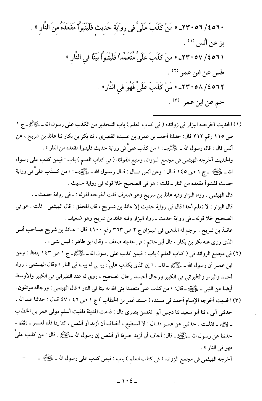 4562/ 23058 - "مَنْ كَذَبَ عَلَيَّ فَهُوَ في النَّار".
