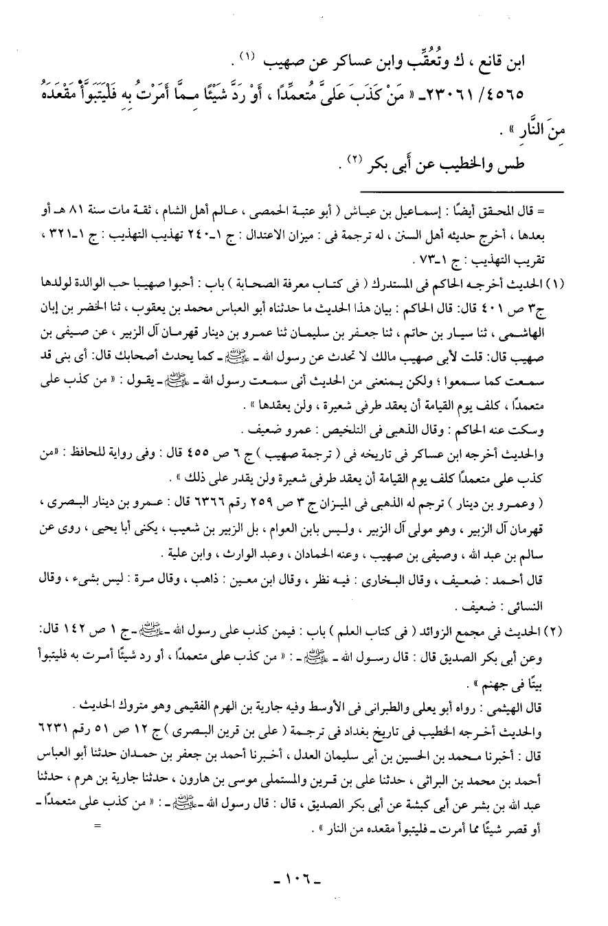 (¬1) الحديث أخرجه الحاكم في المستدرك (في كتاب معرفة الصحابة) باب: أحبوا صهيبا حب الوالدة لولدها ج 3 ص 401 قال: قال الحاكم: بيان هذا الحديث ما حدثناه أبو العباس محمد بن يعقوب، ثنا الخضر بن إبان الهاشمي، ثنا سيار بن حاتم، ثنا جعفر بن سليمان ثنا عمرو بن دينار قهرمان آل الزبير، عن صيفى بن صهيب قال: قلت لأبي صهيب مالك لا تحدث عن رسول الله - صلى الله عليه وسلم - كما يحدث أصحابك قال: أي بنى قد سمعت كما سمعوا؛ ولكن يمنعنى من الحديث أنى سمعت رسول الله - صلى الله عليه وسلم - يقول: "من كذب على متعمدًا، كلف يوم القيامة أن يعقد طردى شعيرة، ولن يعقدها".