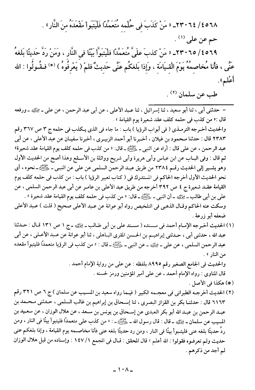 4568/ 23064 - "مَنْ كَذَبَ فِي حُلمِهِ مُتَعَمِّدًا فَليَتبَوأ مَقْعَدَهُ مِنَ النَّار".