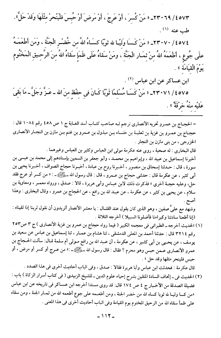 4575/ 23071 - "مَنْ كَسَا مُسْلِمًا ثَوْبًا كَانَ في حِفْظٍ مِنَ الله -عَزَّ وَجَلَّ- مَا بَقِيَ عَليهِ مِنْهُ خِرْقَةٌ".