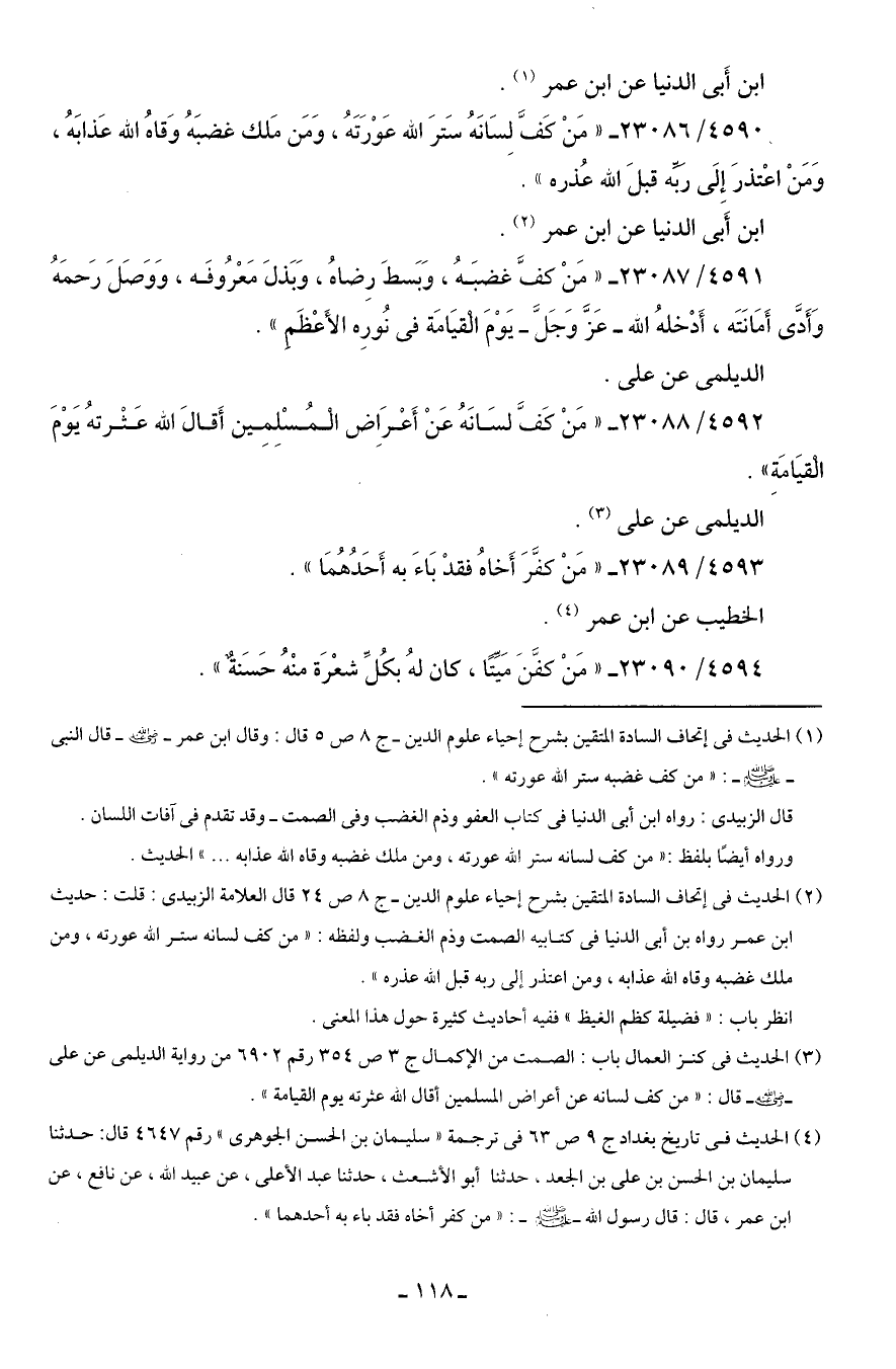 4592/ 23088 - "مَنْ كَفَّ لسَانَهُ عَنْ أَعْرَاض الْمُسْلِمِين أَقال الله عَثْرتهُ يَوْمَ الْقيَامَةِ".
