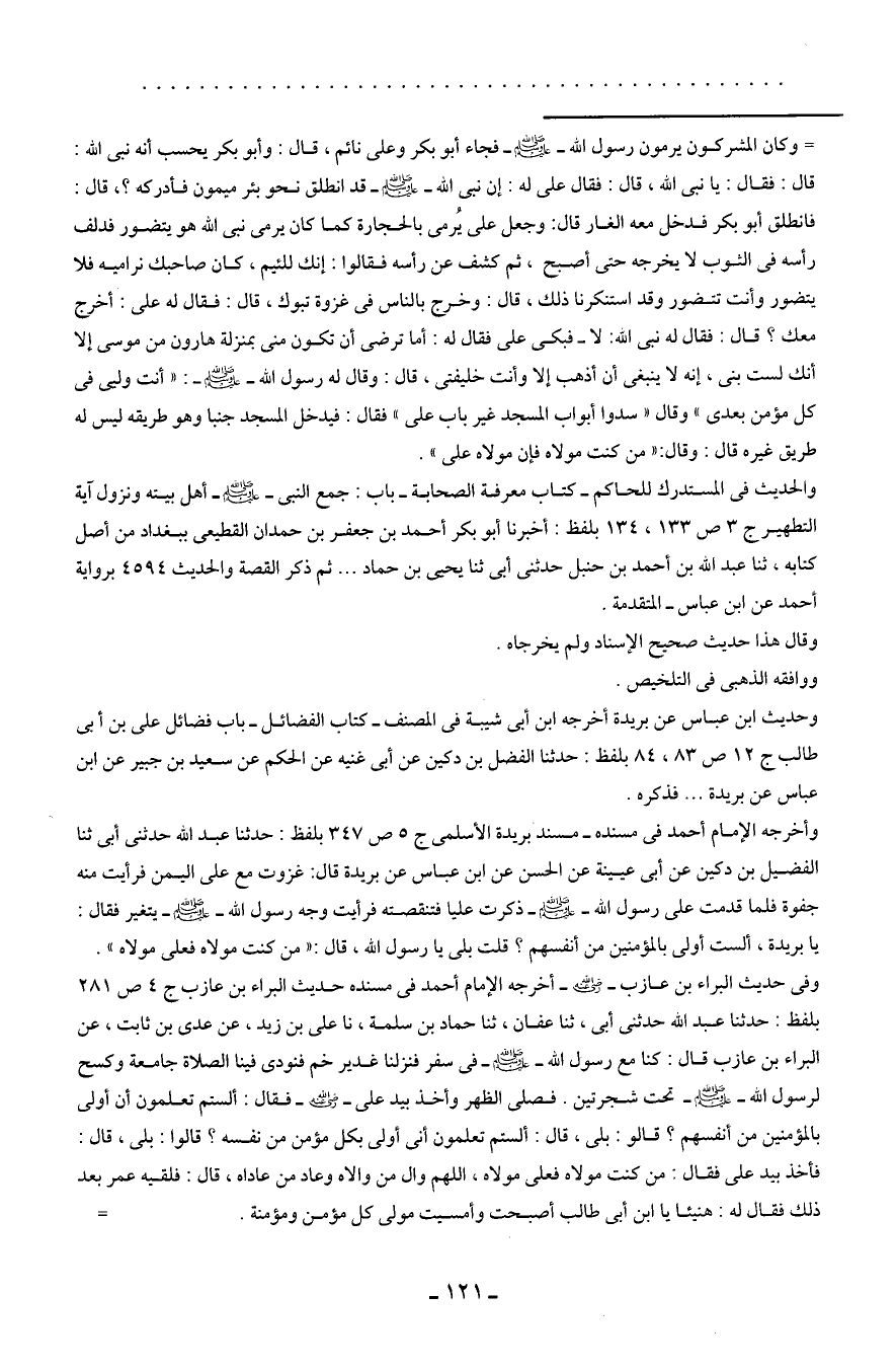 وفي حديث البراء بن عازب - رضي الله عنه - أخرجه الإِمام أحمد في مسنده حديث البراء بن عازب ج 4 ص 281 بلفظ: حدثنا عبد الله حدثني أبي، ثنا عفان، ثنا حماد بن سلمة، نا علي بن زيد، عن عدي بن ثابت، عن البراء بن عازب قال: كنا مع رسول الله - صلى الله عليه وسلم - في سفر فنزلنا غدير خم فنودى فينا الصلاة جامعة وكسح لرسول الله - صلى الله عليه وسلم - تحت شجرتين. فصلى الظهر وأخذ بيد علي - رضي الله عنه - فقال: ألستم تعلمون أن أولى بالمؤمنين من أنفسهم؟ قالو: بلى، قال: ألستم تعلمون أني أولى بكل مؤمن من نفسه؟ قالوا: بلى، قال: فأخذ بيد علي فقال: من كنت مولاه فعلي مولاه، اللهم وال من والاه وعاد من عاداه، قال: فلقيه عمر بعد ذلك فقال له: هنيئا يا ابن أبي طالب أصبحت وأمسيت مولى كل مؤمن ومؤمنة. =