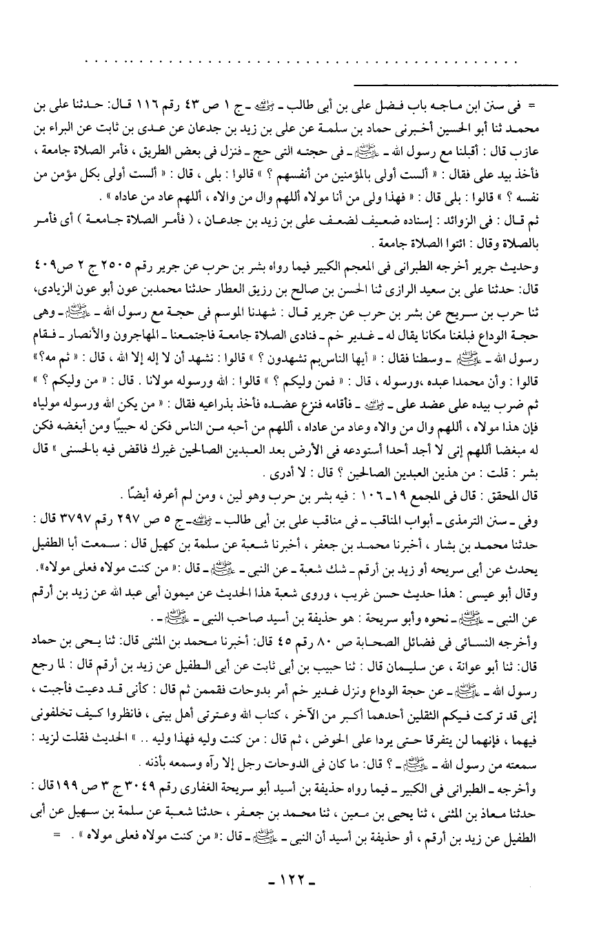 = في سنن ابن ماجه باب فضل علي بن أبي طالب - رضي الله عنه - ج 1 ص 43 رقم 116 قال: حدثنا علي بن محمَّد ثنا أبو الحسين أخبرني حماد بن سلمة عن علي بن زيد بن جدعان عن عدي بن ثابت عن البراء بن عازب قال: أقبلنا مع رسول الله - صلى الله عليه وسلم - في حجته التي حج- فنزل في بعض الطريق، فأمر الصلاة جامعة، فأخذ بيد علي فقال: "ألست أولى بالمؤمنين من أنفسهم؟ " قالوا: بلى، قال: "ألست أولى بكل مؤمن من نفسه؟ " قالوا: بلى قال: "فهذا ولى من أنا مولاه اللهم وال من والاه، اللهم عاد من عاداه".