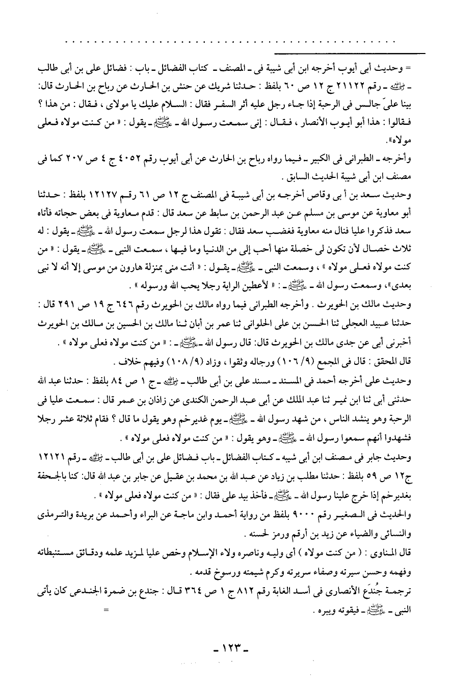 وحديث على أخرجه أحمد في المسند- مسند علي بن أبي طالب - رضي الله عنه - ج 1 ص 84 بلفظ: حدثنا عبد الله حدثني أبي ثنا ابن نمير ثنا عبد الملك عن أبي عبد الرحمن الكندى عن زاذان بن عمر قال: سمعت عليا في الرحبة وهو ينشد الناس، من شهد رسول الله - صلى الله عليه وسلم - يوم غدير خم وهو يقول ما قال: فقام ثلاثة عشر رجلا فشهدوا أنهم سمعوا رسول الله - صلى الله عليه وسلم - وهو يقول: "من كنت مولاه فعلى مولاه".