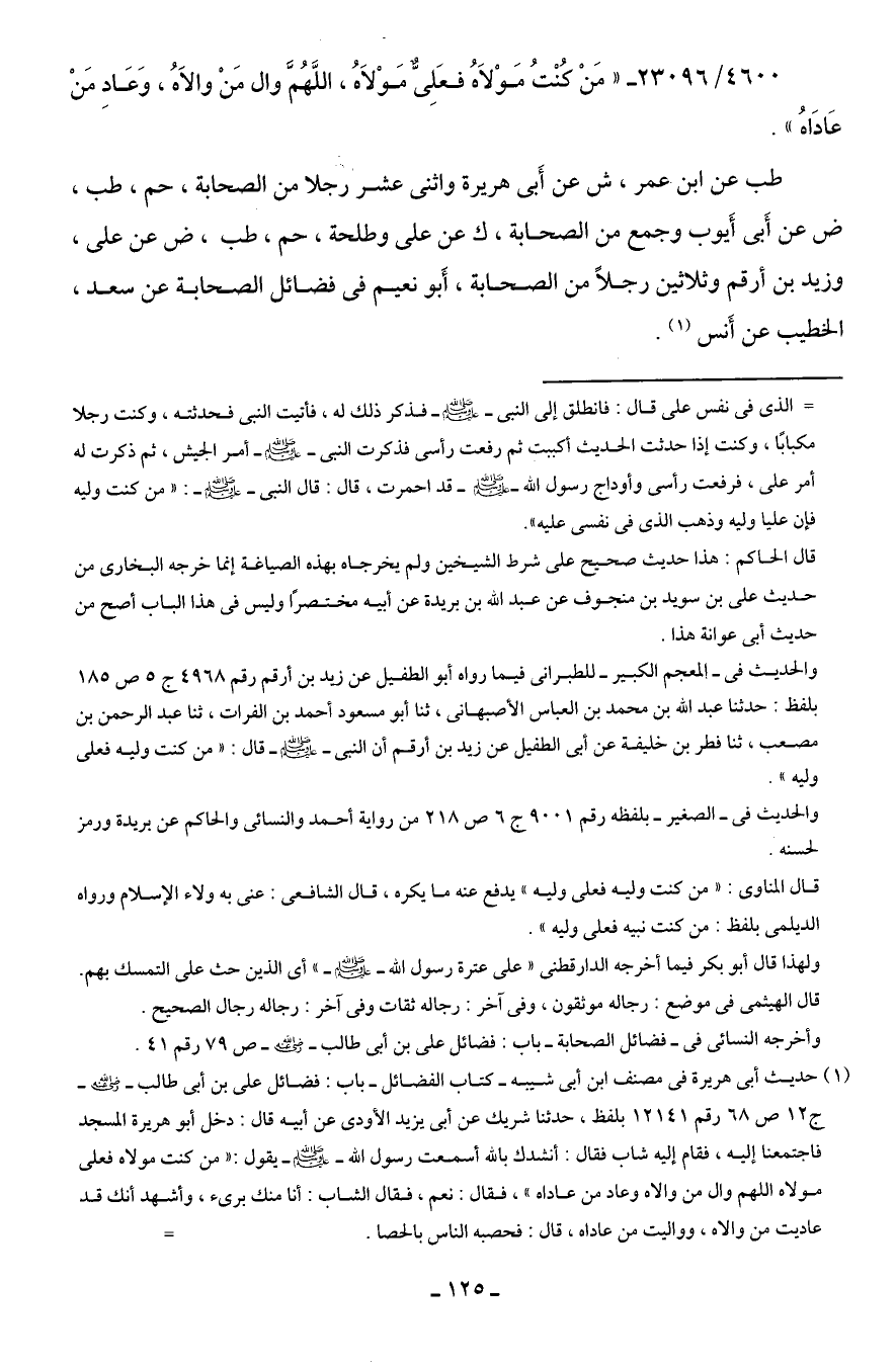 4600/ 23096 - "مَنْ كُنْتُ مَوْلاهُ فعَلِيٌّ مَوْلاهُ، اللَّهُمَّ وال مَنْ والاهُ، وَعَادِ مَنْ عَادَاهُ".