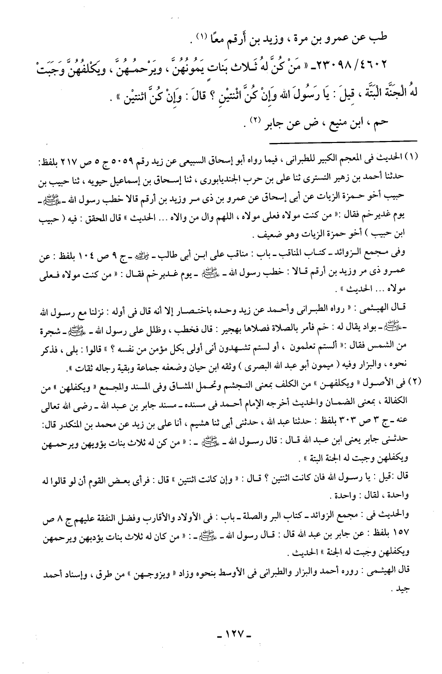 (¬1) الحديث في المعجم الكبير للطبراني، فيما رواه أبو إسحاق السبيعى عن زيد رقم 5059 ج 5 ص 217 بلفظ: حدثنا أحمد بن زهير التستري ثنا علي بن حرب الجنديابورى، ثنا إسحاق بن إسماعيل حيويه، ثنا حبيب بن حبيب أخو حمزة الزيات عن أبي إسحاق عن عمرو بن ذي مر وزيد بن أرقم قالا خطب رسول الله - صلى الله عليه وسلم - يوم غدير خم فقال: "من كنت مولاه فعلي مولاه، اللهم وال من والاه ... الحديث" قال المحقق: فيه (حبيب بن حبيب) أخو حمزة الزيات وهو ضعيف.