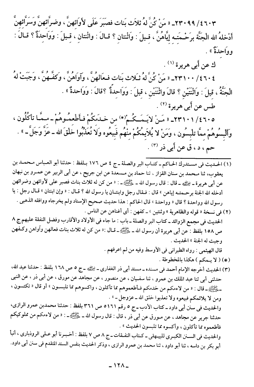 4604/ 23100 - "مَنْ كُنَّ لهُ ثَلاث بَنات فعَالهُنَّ، وآوَاهُنَ، وَكفَّهُنَّ، وَجَبَتْ لهُ الْجَنَّةُ، قِيلَ: وَاثْنَتَينِ؟ قال واثْنَتَينِ، قِيلَ: وَوَاحِدةٌ؟ قال: وَوَاحدةٌ".