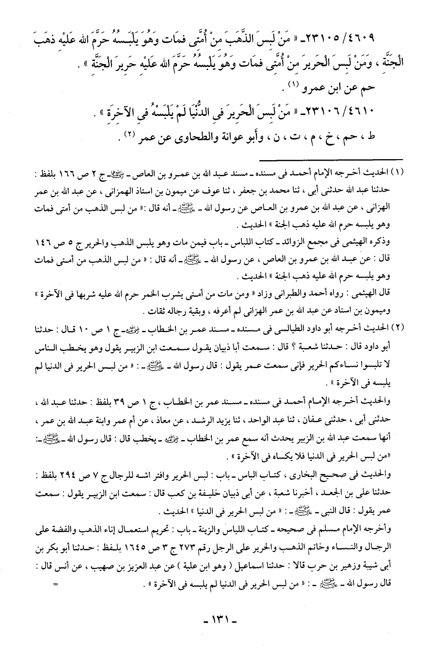 4610/ 23106 - "مَنْ لَبِسَ الْحَرِيرَ في الدُّنْيَا لَمْ يَلبَسْهُ في الآخِرَةِ".