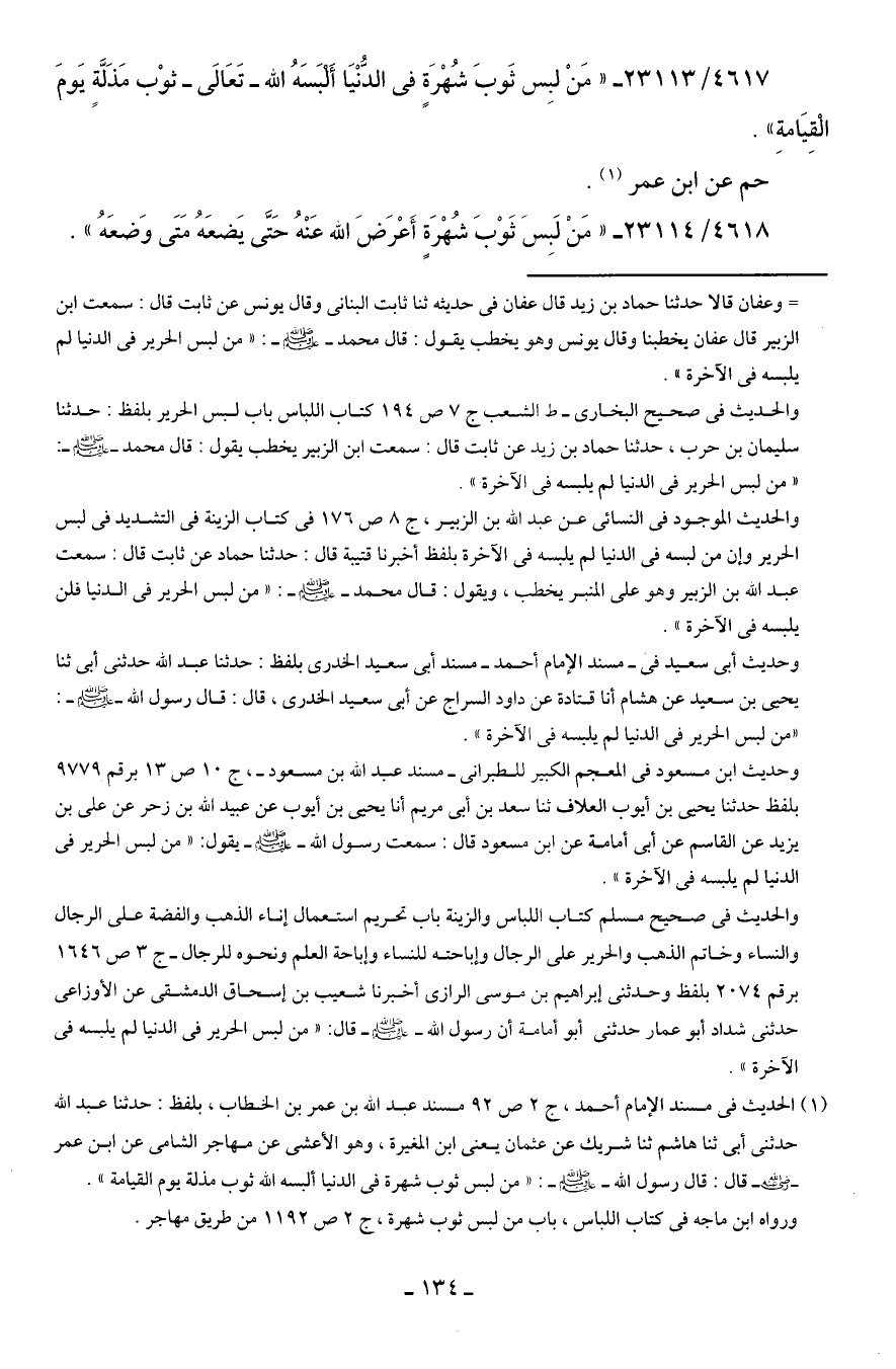 4617/ 23113 - "مَنْ لبِس ثَوبَ شُهْرَةٍ في الدُّنْيَا أَلْبَسَهُ الله -تَعَالى- ثوْب مَذَلَّةٍ يَومَ الْقِيَامةِ".