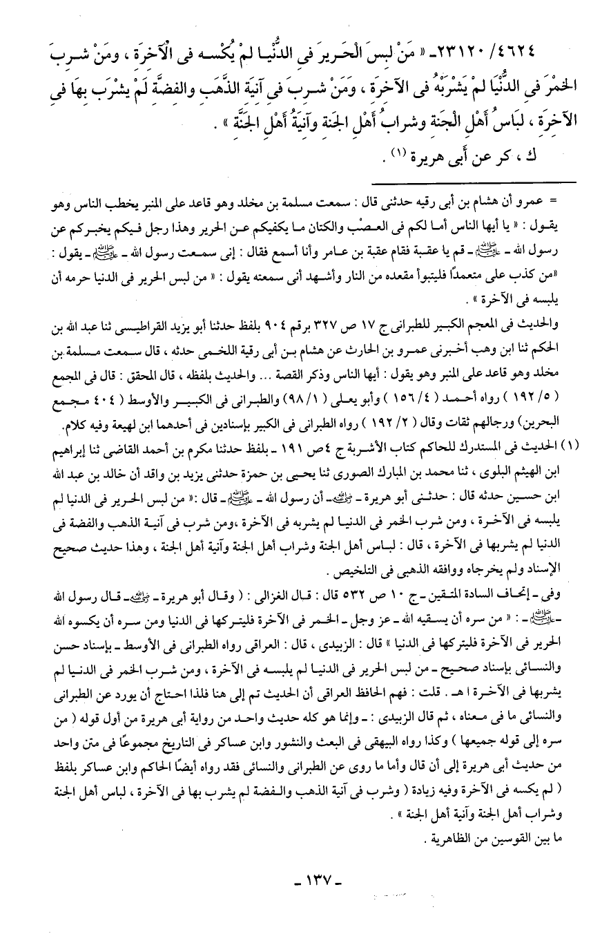 4624/ 23120 - "مَنْ لبِسَ الْحَريرَ في الدُّنيا لمْ يُكْسه في الآخِرَةِ، ومَنْ شرِبَ الخمْرَ في الدُّنْيَا لمْ يَشْرَبْهُ في الآخِرَة، وَمَنْ شرِبَ في آنِيَةِ الذَّهَبِ والفِضَّةِ لَمْ يشْرَب بِهَا في الآخِرَةِ، لبَاسُ أَهْلِ الْجَنةِ وشرابُ أَهْلِ الجَنةِ وآنِيَةُ أَهْلِ الجَنَّةِ".