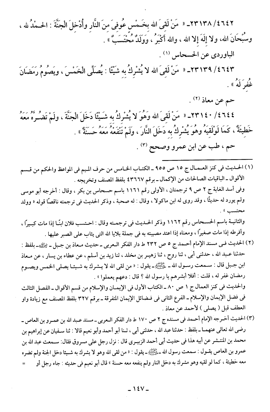 4644/ 23140 - "مَنْ لَقِيَ الله وَهُوَ لا يُشْرِكُ بِهِ شَيئًا دَخَلَ الْجَنَّةَ، ولَمْ تَضُرَّهُ مَعَهُ خَطِيئَة، كَمَا لَوْ لَقِيَهُ وهُوَ يُشْرِكُ بِهِ دَخَلَ النَّارَ، وَلَمْ تَنْفَعْهُ مَعَهُ حَسَنَةٌ".