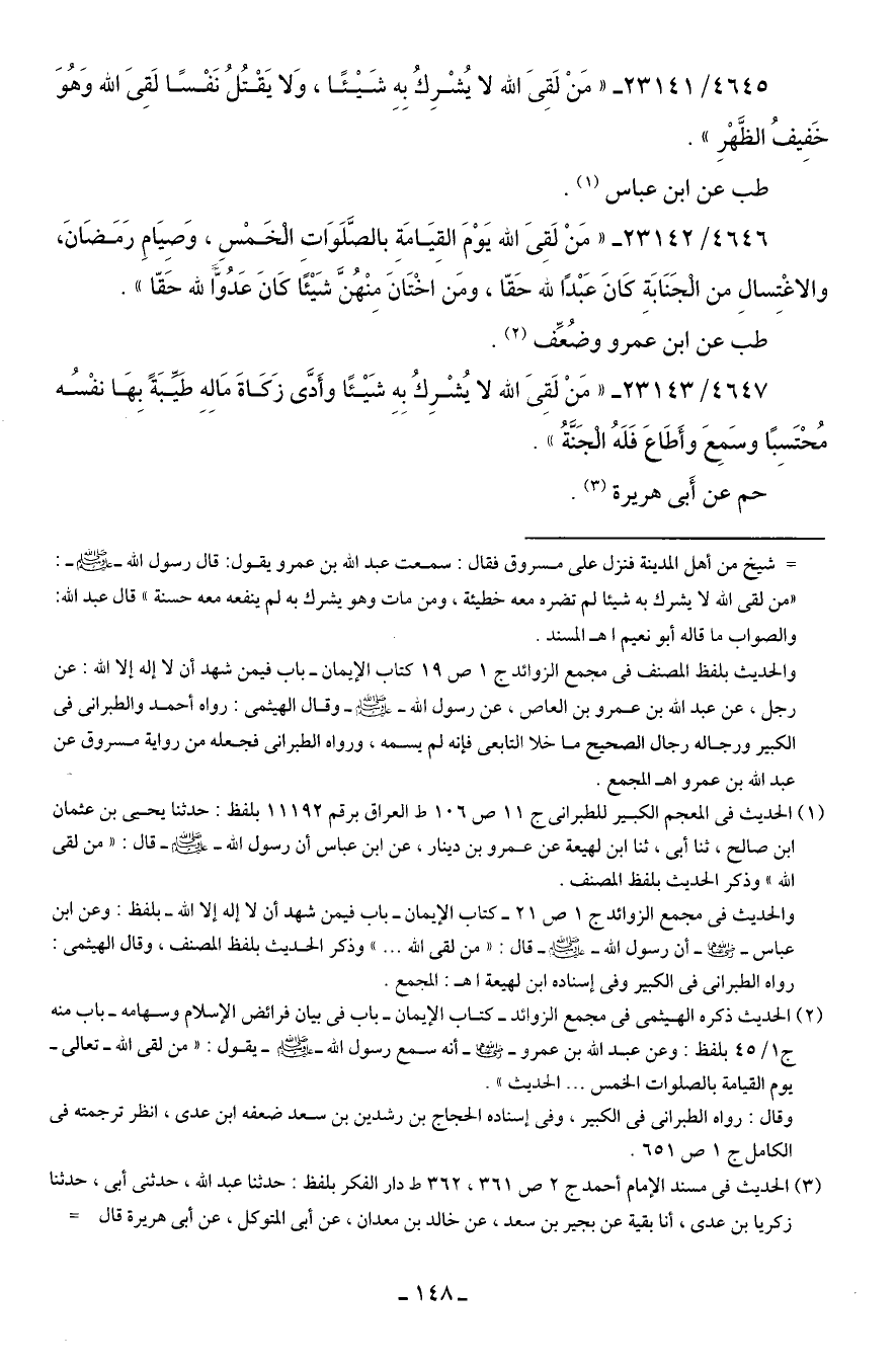 4645/ 23141 - "مَنْ لَقِيَ الله لا يُشْرِكُ بِهِ شَيئًا، وَلا يَقْتُلُ نَفْسًا لَقِيَ الله وَهُوَ خَفِيفُ الظَّهْرِ".