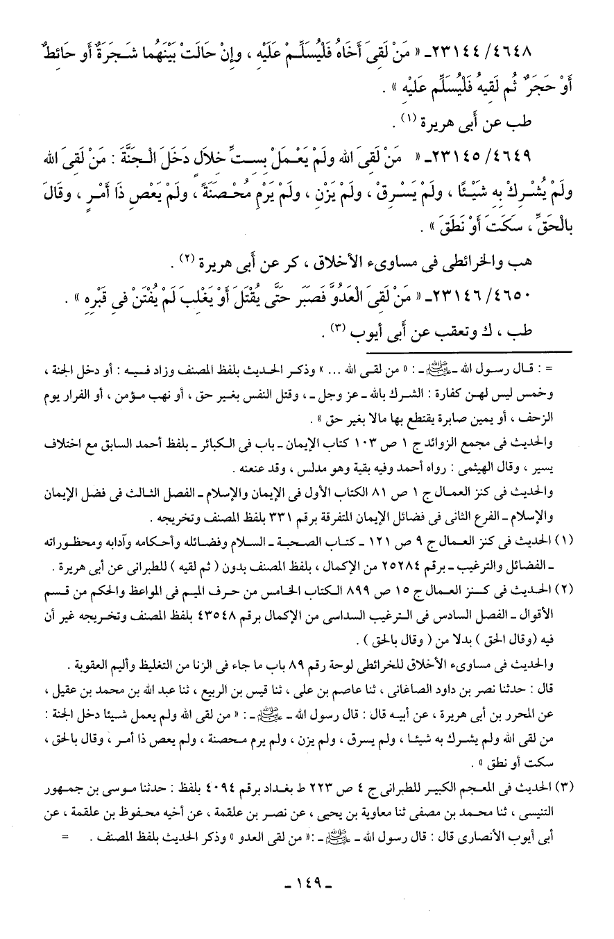 4648/ 23144 - "مَنْ لَقِيَ أَخَاهُ فَليُسَلِّمْ عَلَيهِ، وإنْ حَالتْ بَينَهُما شَجَرَةٌ أَو حَائِطٌ أَوْ حَجَرٌ ثُم لَقِيهُ فَليُسَلِّم عَليهِ".
