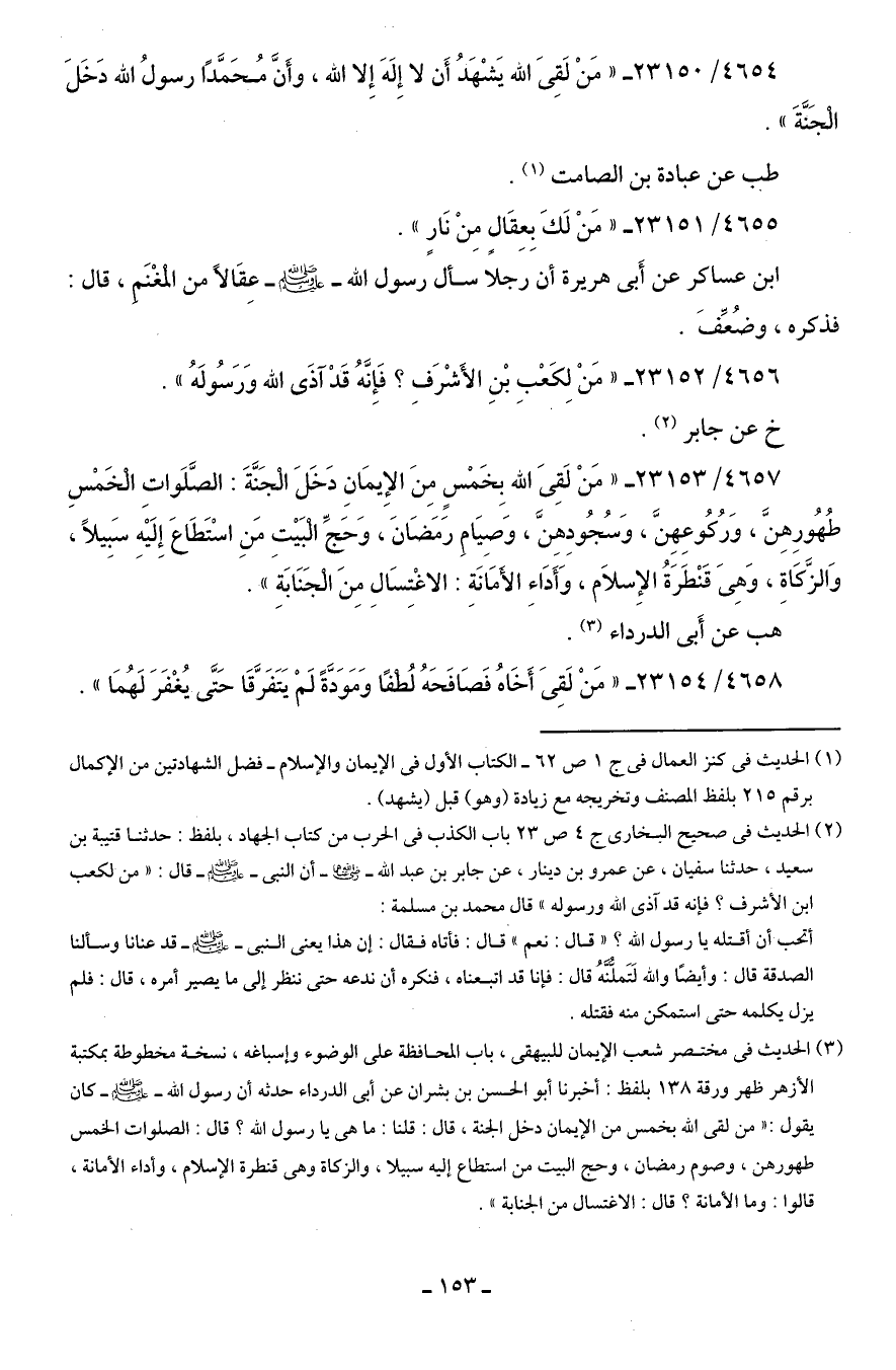 4654/ 23150 - "مَنْ لَقِيَ الله يَشْهَدُ أَن لا إِلَهَ إِلا الله، وأَنَّ مُحَمَّدًا رسولُ الله دَخَلَ الْجَنَّةَ".