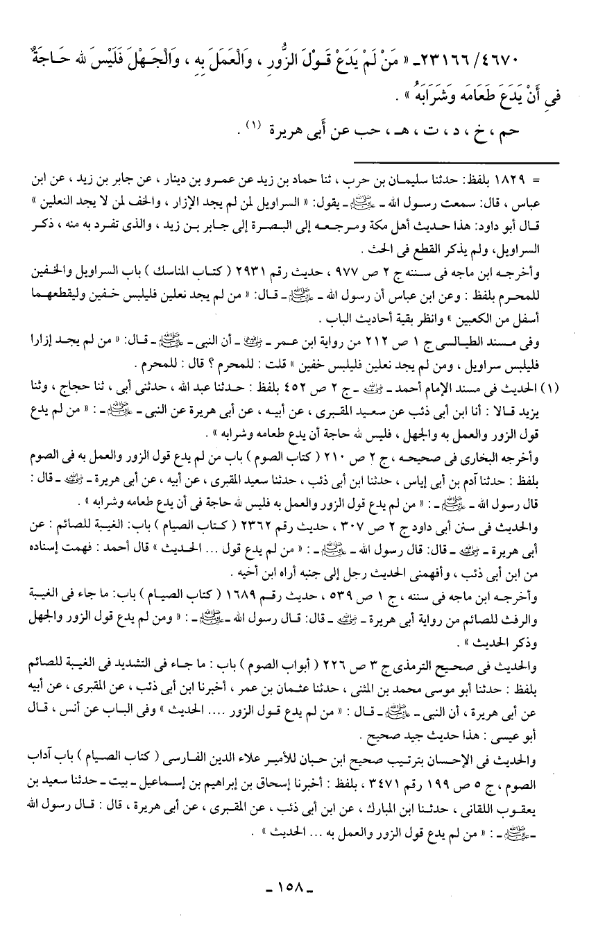 4670/ 23166 - "مَنْ لَمْ يَدَعْ قَوْلَ الزُّورِ، وَالْعَمَلَ بِهِ، وَالْجَهْلَ فَلَيسَ لله حَاجَةٌ في أَنْ يَدَعَ طَعَامَه وَشَرَابَهُ".
