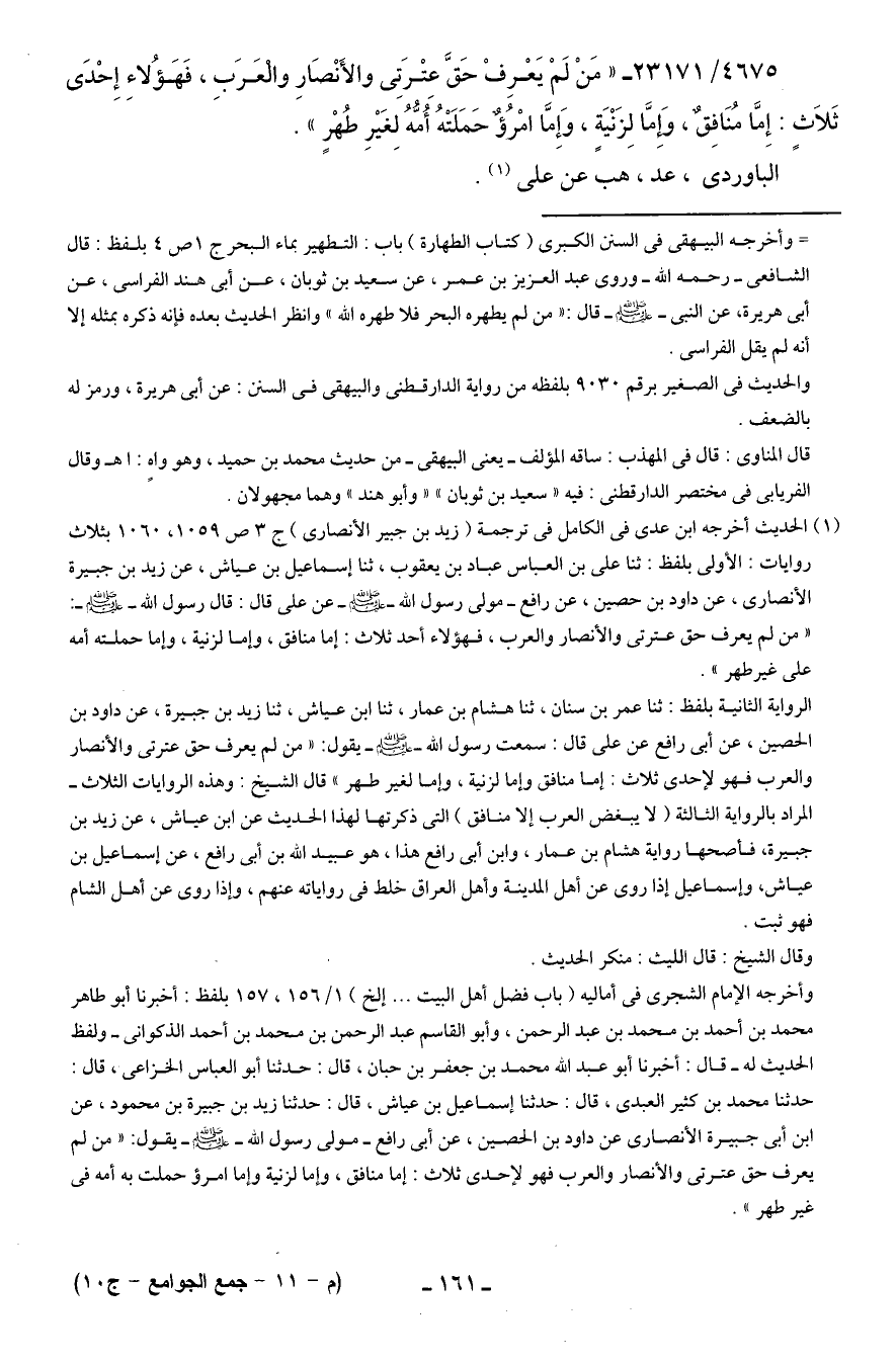 (¬1) الحديث أخرجه ابن عدي في الكامل في ترجمة (زيد بن جبير الأنصاري) ج 3 ص 1059، 1060 بثلاث روايات: الأولى بلفظ: ثنا علي بن العباس عباد بن يعقوب، ثنا إسماعيل بن عياش، عن زيد بن جبيرة الأنصاري، عن داود بن حصين، عن رافع -مولى رسول الله - صلى الله عليه وسلم - عن علي قال: قال رسول الله - صلى الله عليه وسلم -: "من لم يعرف حق عترتى والأنصار والعرب، فهؤلاء أحد ثلاث: إما منافق، وإما لزنية، وإما حملته أمه على غير طهر".
