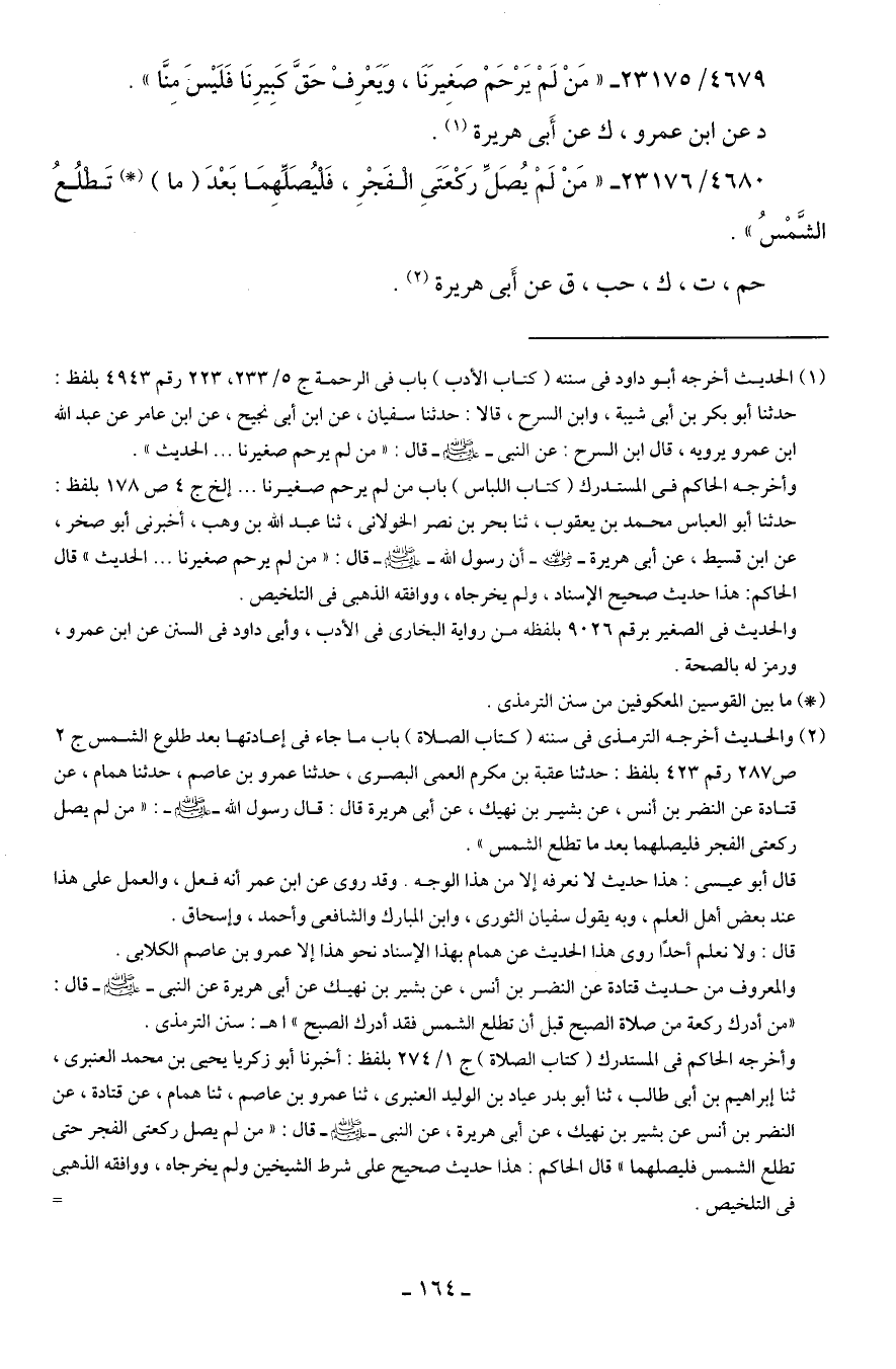 (¬1) الحديث أخرجه أبو داود في سننه (كتاب الأدب) باب في الرحمة ج 5/ 233، 223 رقم 4943 بلفظ: حدثنا أبو بكر بن أبي شيبة، وابن السرح، قالا: حدثنا سفيان، عن ابن أبي نجيح، عن ابن عامر عن عبد الله بن عمرو يرويه، قال ابن السرح: عن النبي - صلى الله عليه وسلم - قال: "من لم يرحم صغيرنا ... الحديث".